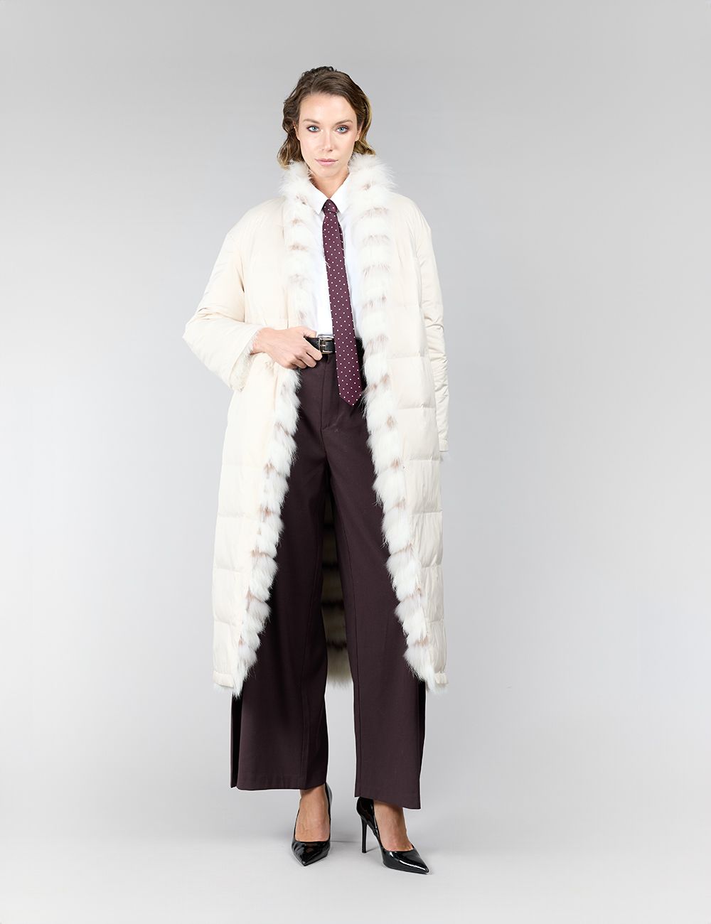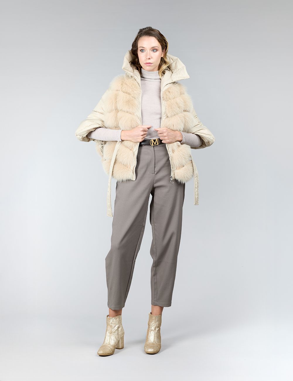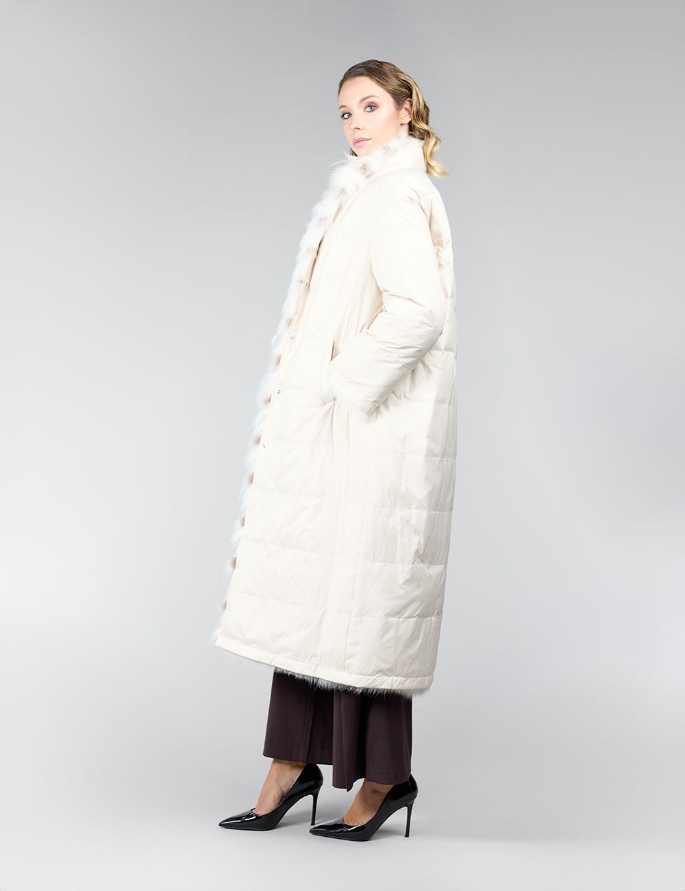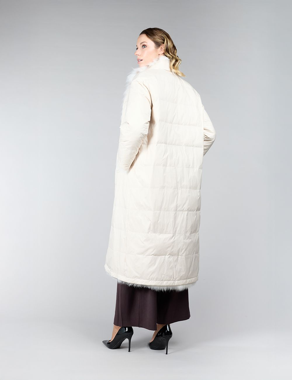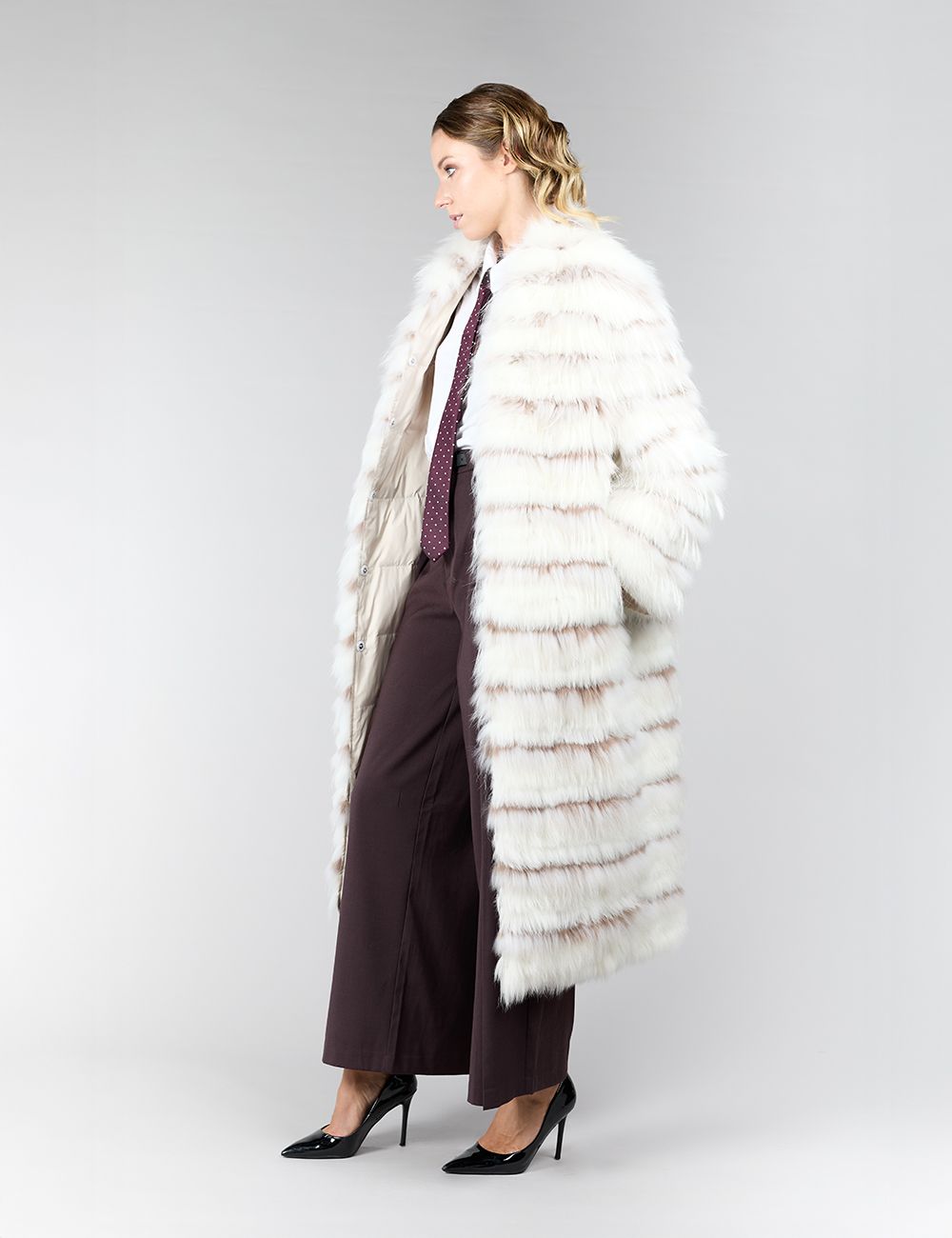 Reversible coat in raccoon fur and fabric, white and taupe color, 120 cm.