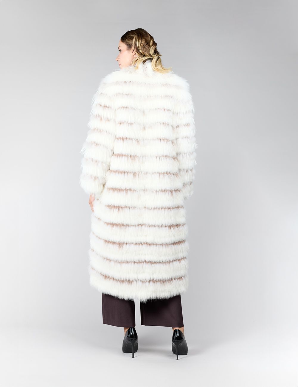 Long reversible coat in raccoon fur and fabric in white and dove grey color, with shawl collar, button closure and side pockets, ideal for a contemporary and sophisticated look, 120 cm.