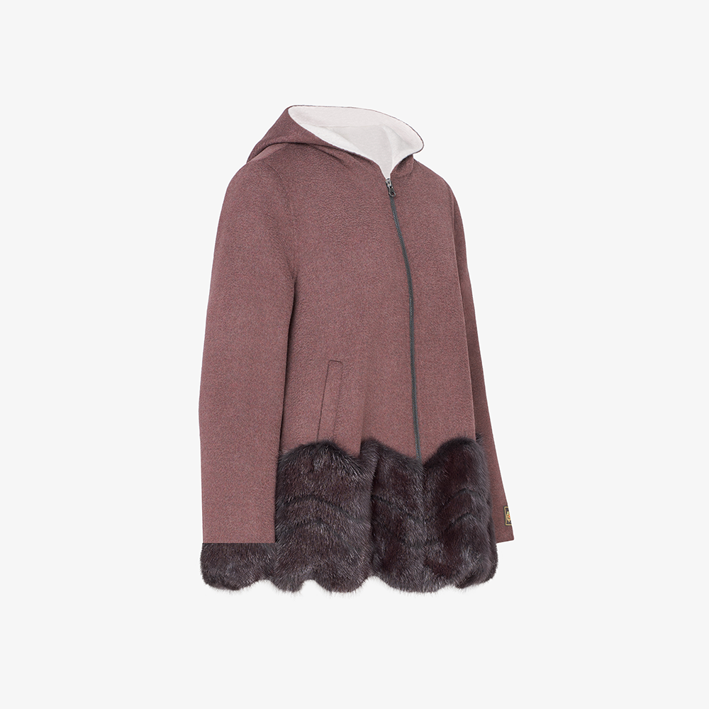 Loro Piana cashmere coat, hood, mink trim, zip closure, burgundy color, 70 cm