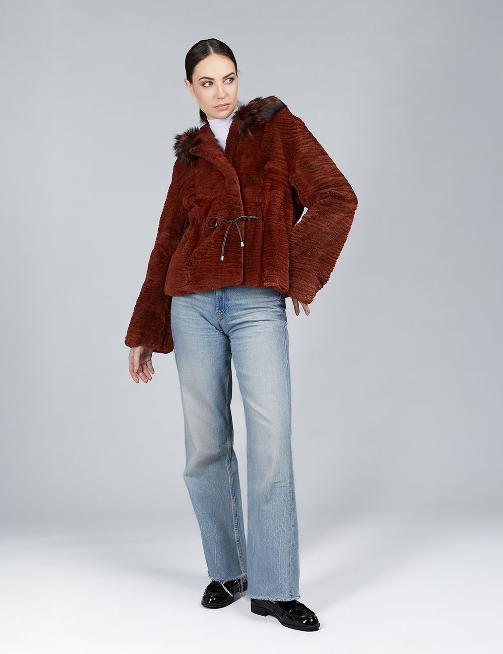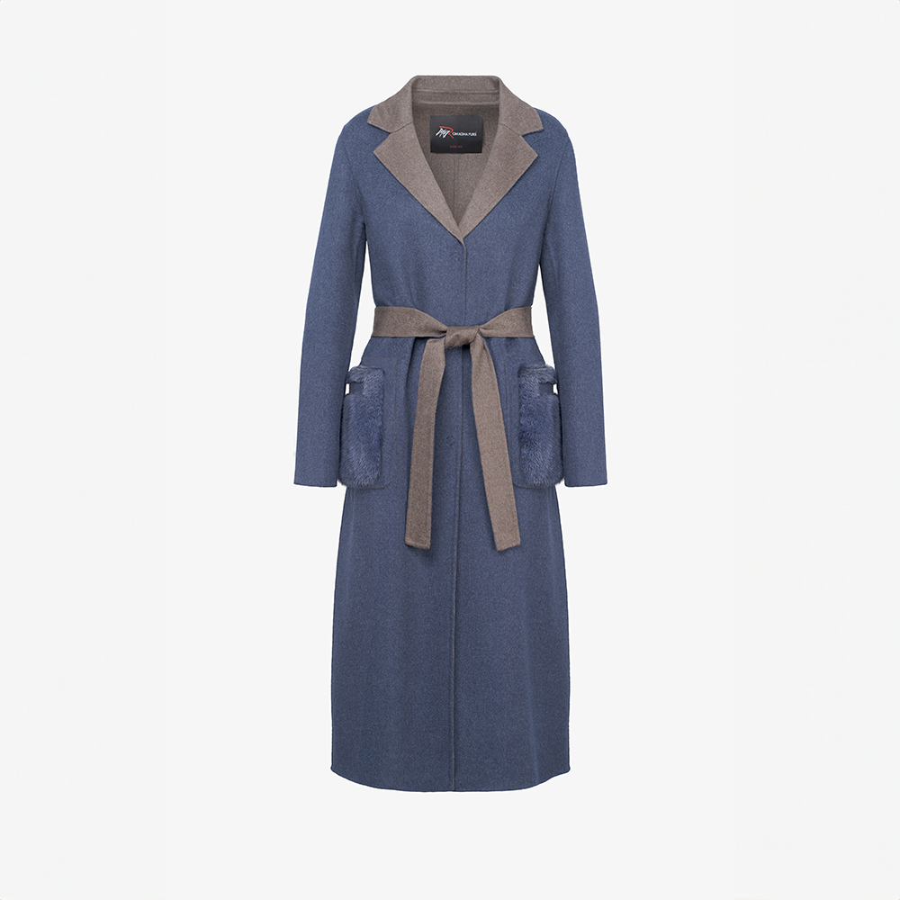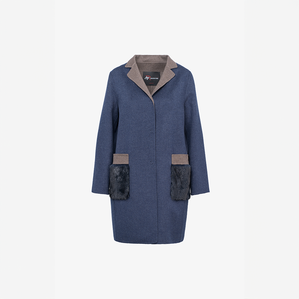 Cashmere coat with mink collar and pockets, blue color, 90 cm