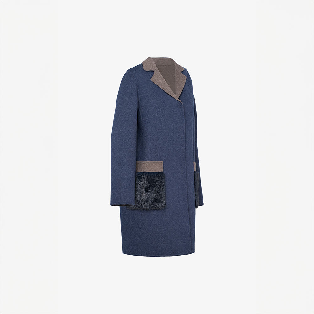 Loro Piana cashmere coat, mink collar and pockets, blue color, 90 cm