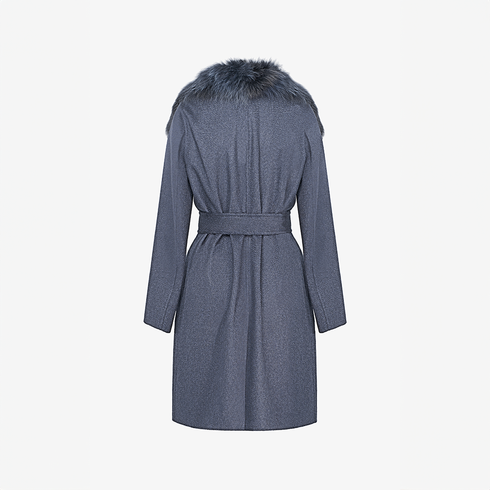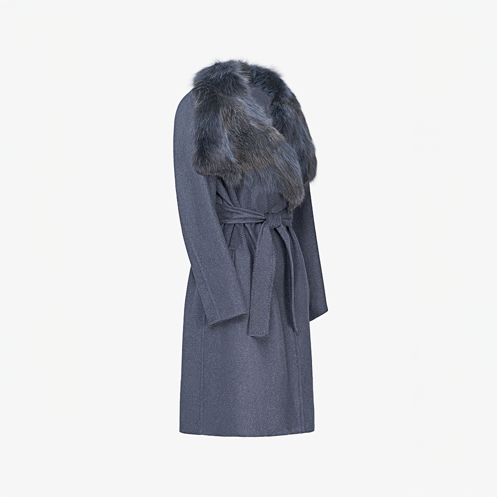 Cashmere coat, wide collar in patch fox, belt, blue color, 95 cm