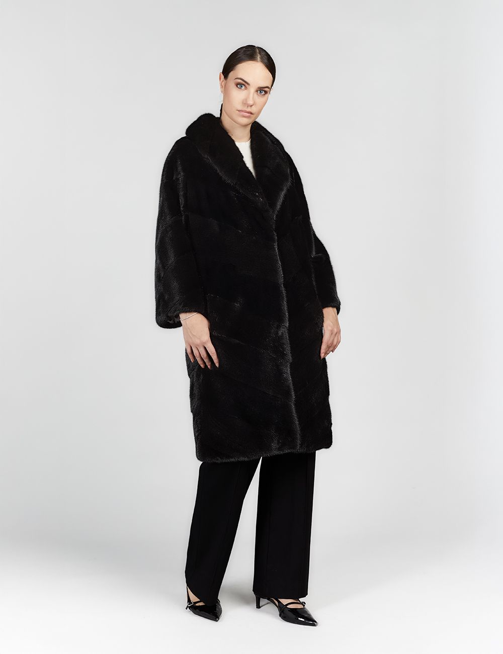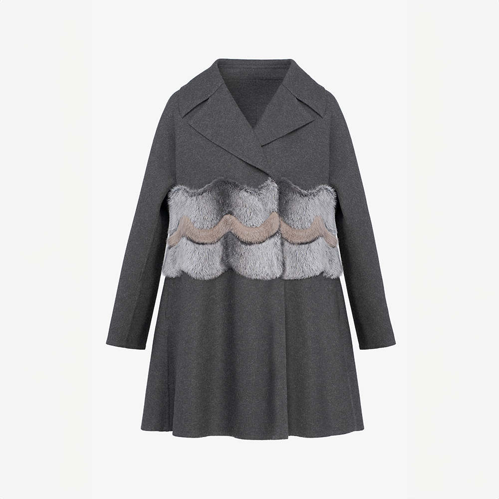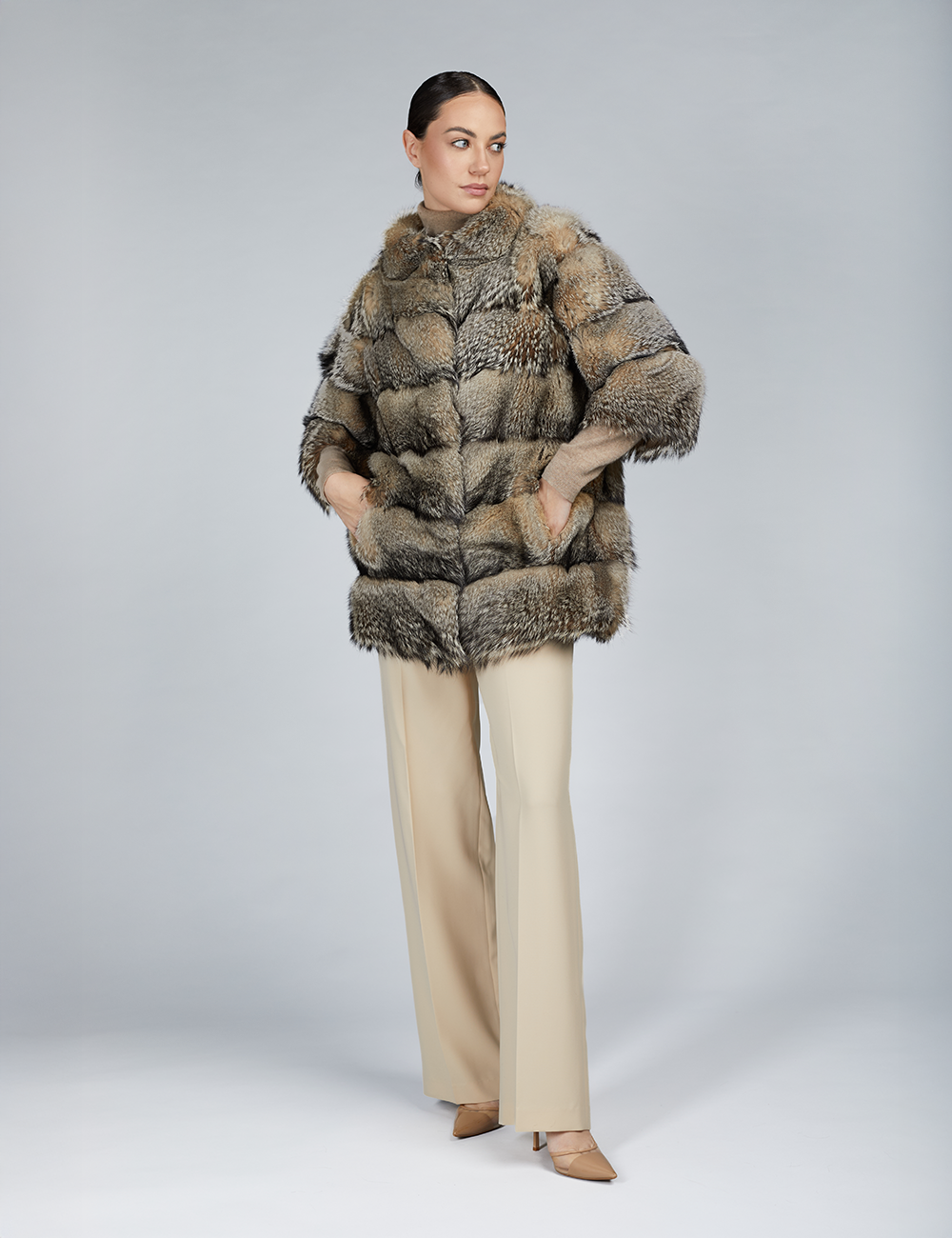 Loro Piana cashmere vest, hood, fox trim, dove grey color, 65 cm