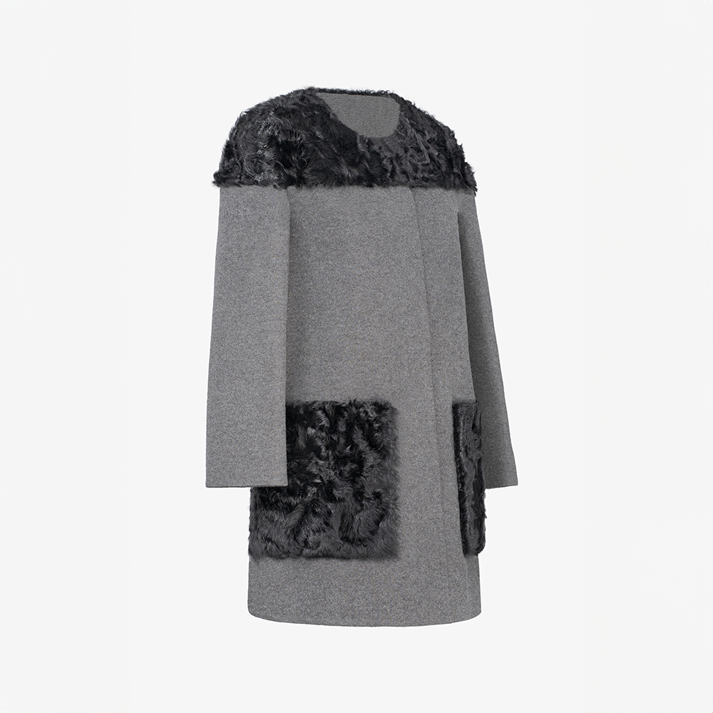 Loro Piana cashmere coat, collarless, details in Persian fur, patch pockets, grey, 80 cm