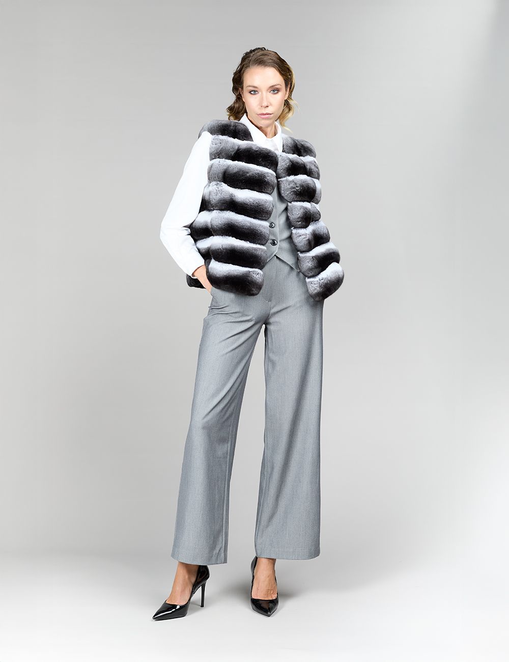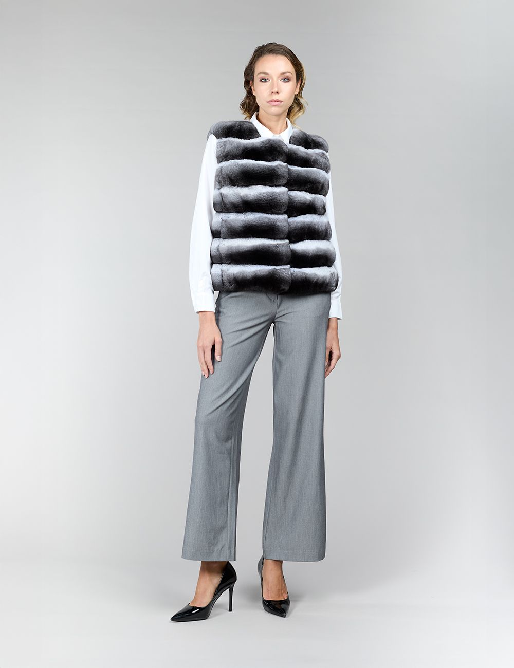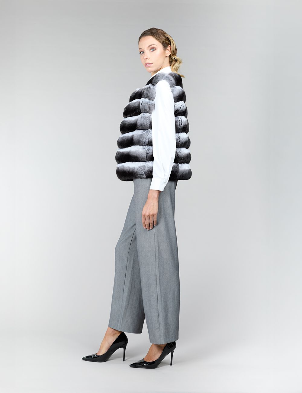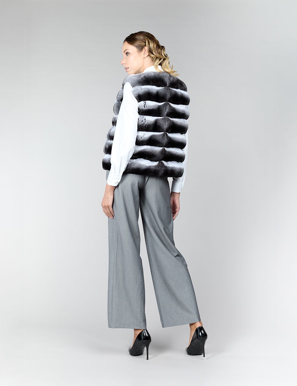 Vest in horizontal banded chinchilla, low round neckline, hidden closure with hooks, straight and slightly wide line, inserted side pockets, 55 cm.