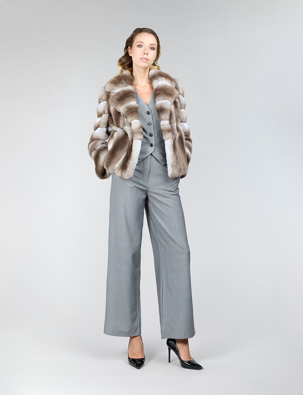 Vest in chinchilla with horizontal stripes, low round neck, hidden closure with hooks, straight and slightly loose fit, inserted side pockets, 55 cm.