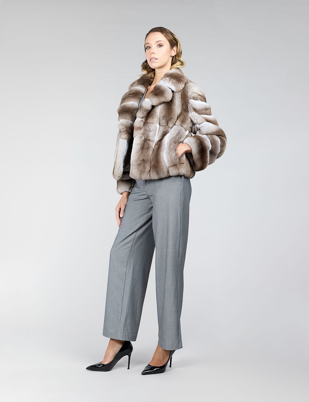 Short beige chinchilla jacket with elegant shawl collar. Refined and lightweight style, 50 cm.