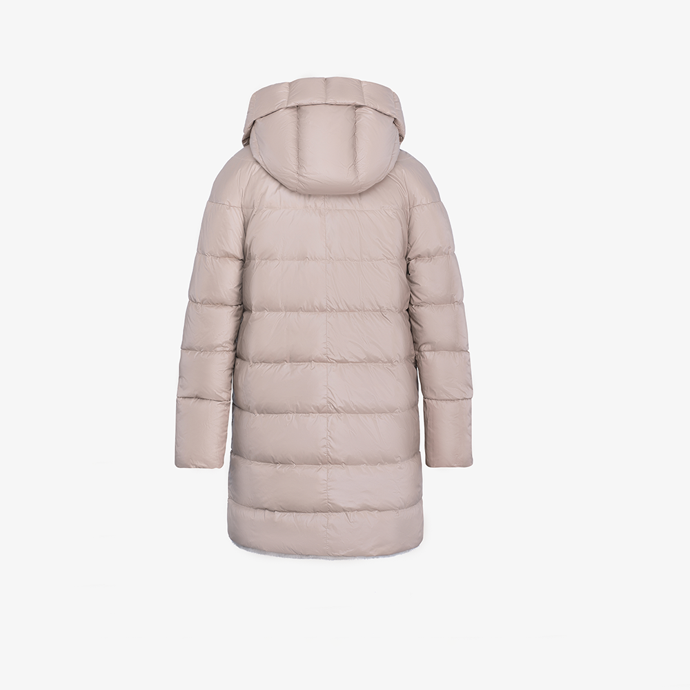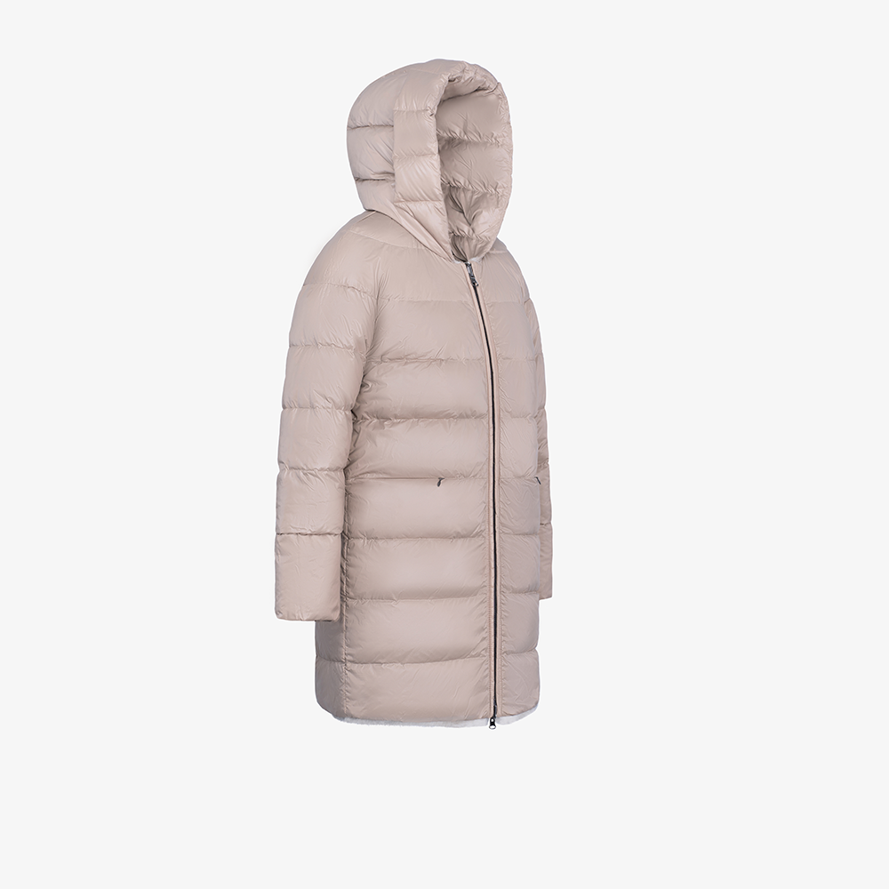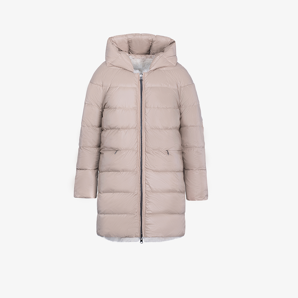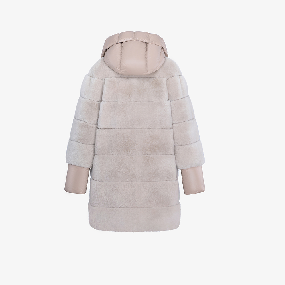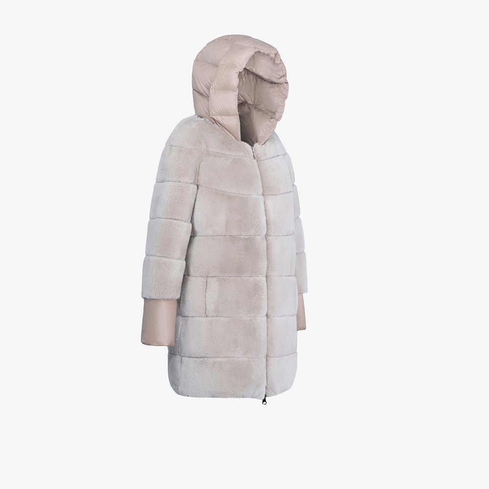 Rex fur reversible down jacket with hood, beige color, 85 cm