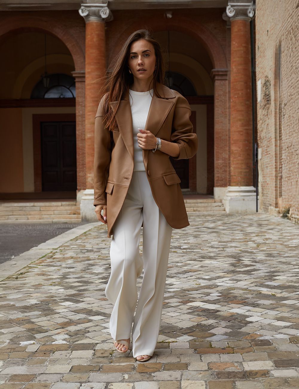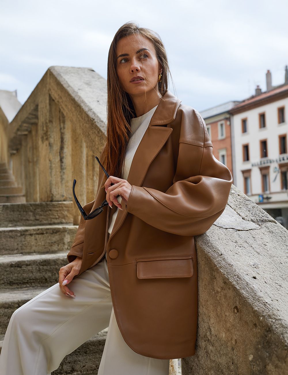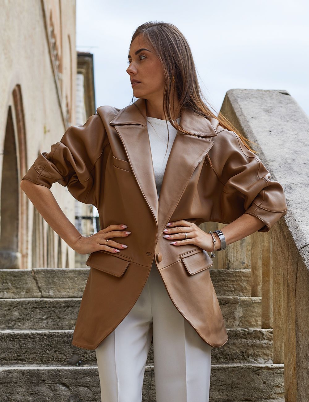 Oversized leather blazer, highlighted waist, button closure, camel, 80 cm
