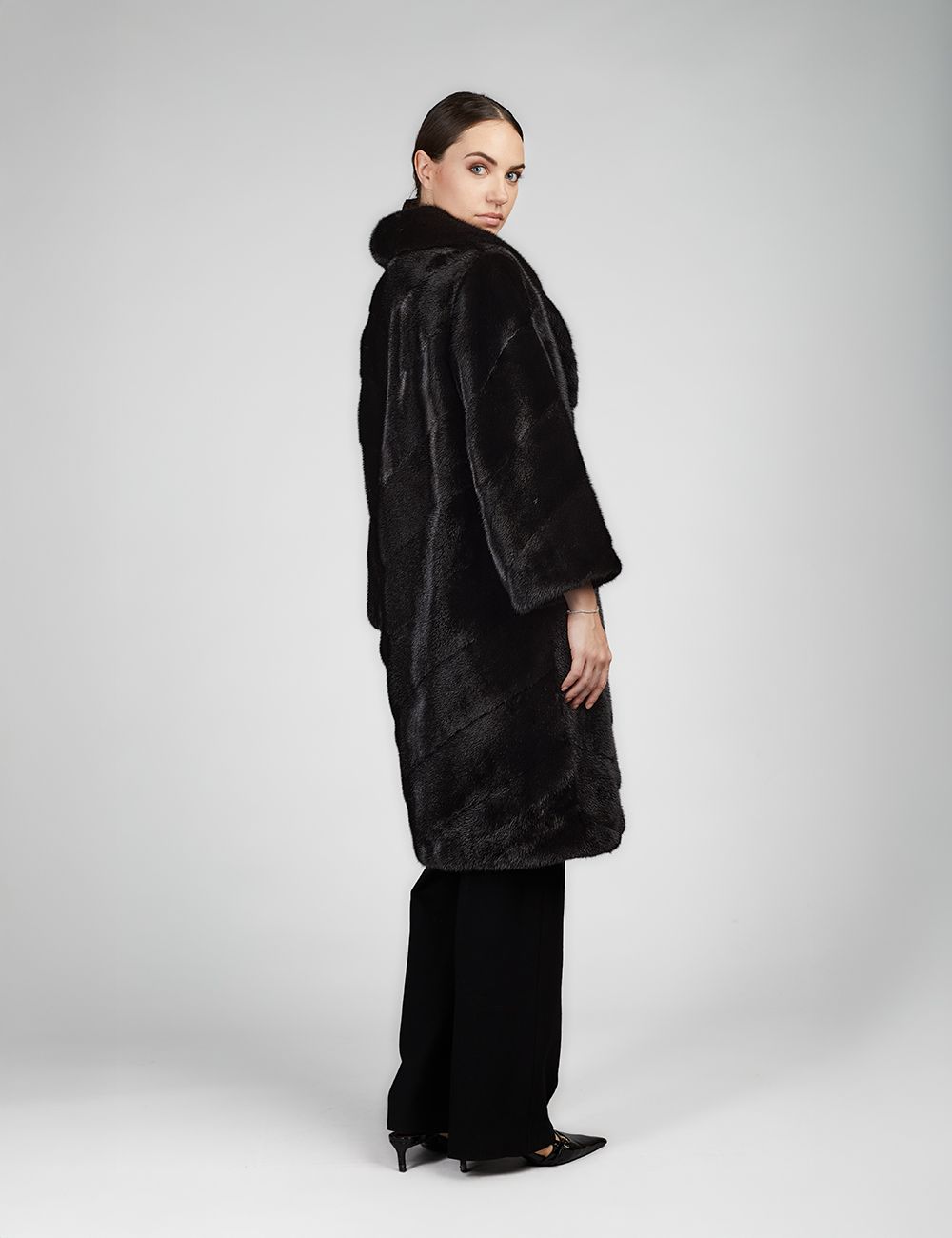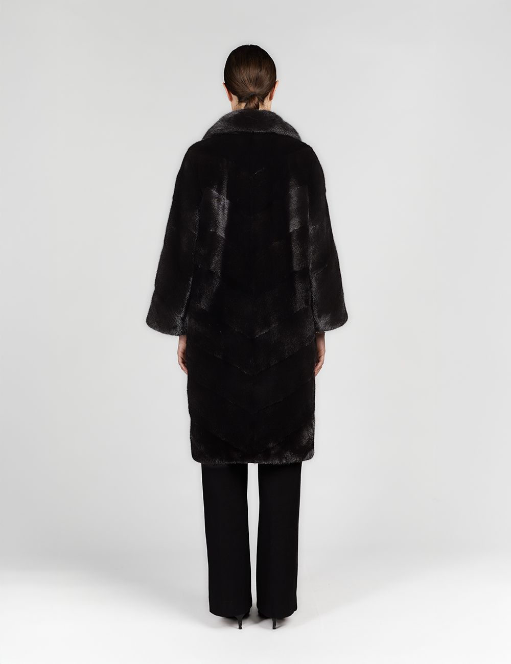 Mink coat with English collar and diagonal layout, black color, 100 cm