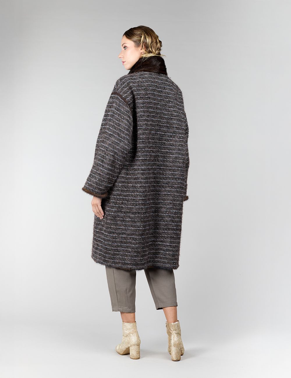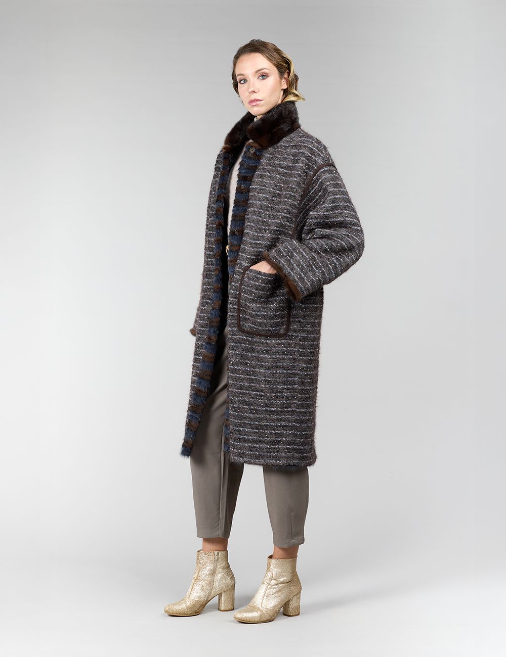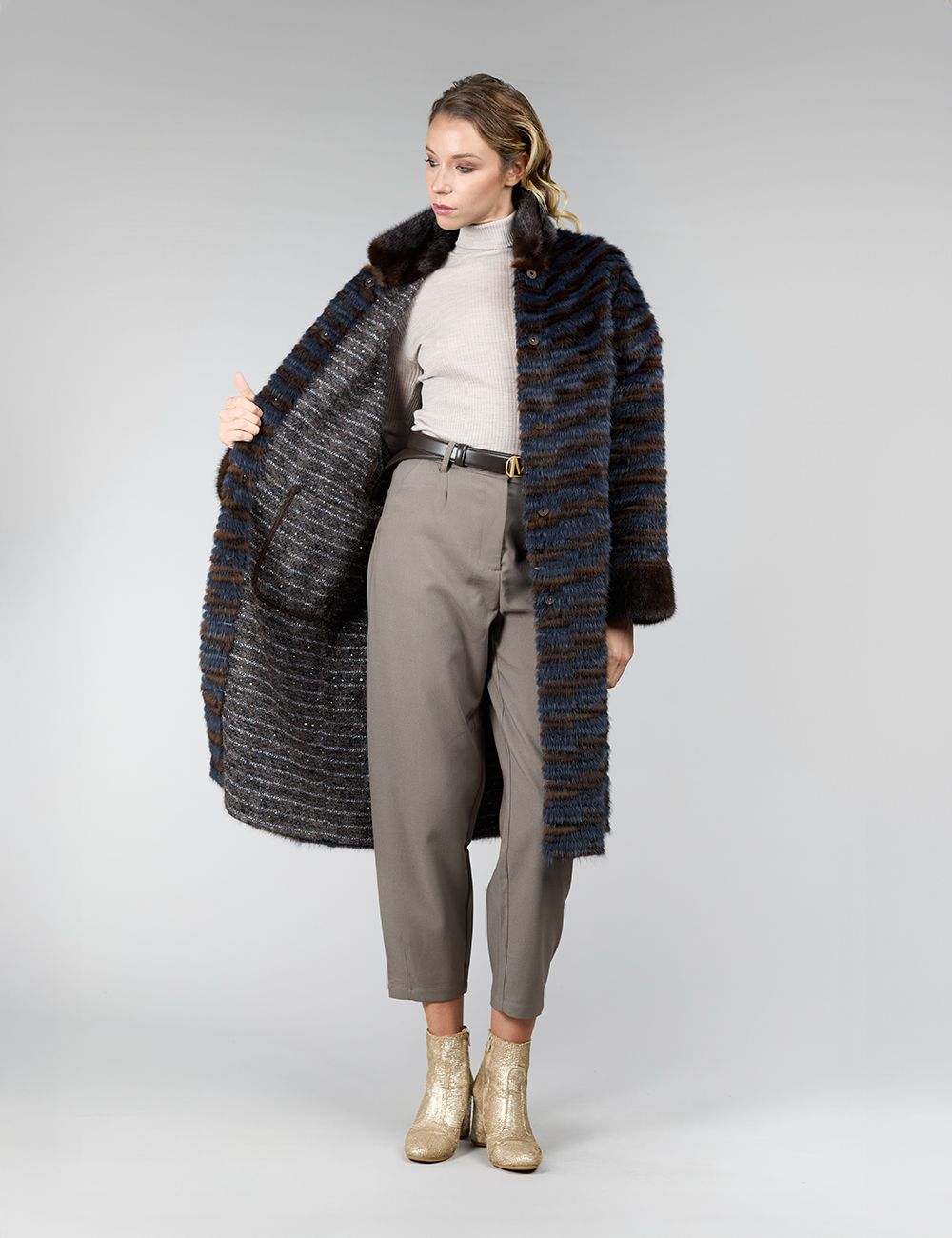 Cappotto reversibile in visone demi buff e tessuto grigio con lavorazione orizzontale, collo alto in visone scuro, maniche con risvolto e bordi in pelliccia, chiusura con bottoni a pressione, tasche applicate su un lato e inserite sull’altro, linea dritta e ampia, 105 cm