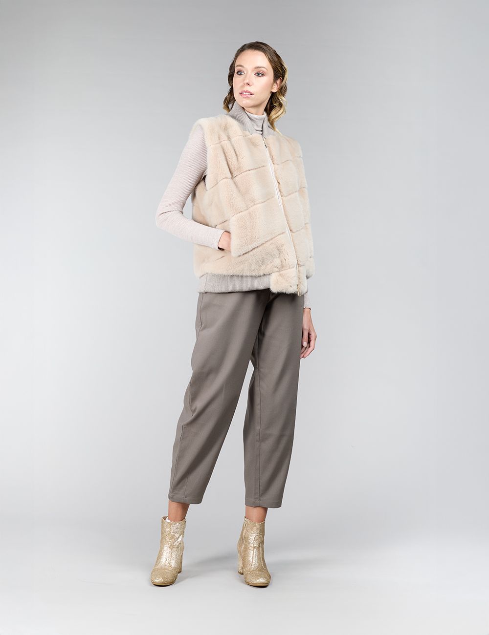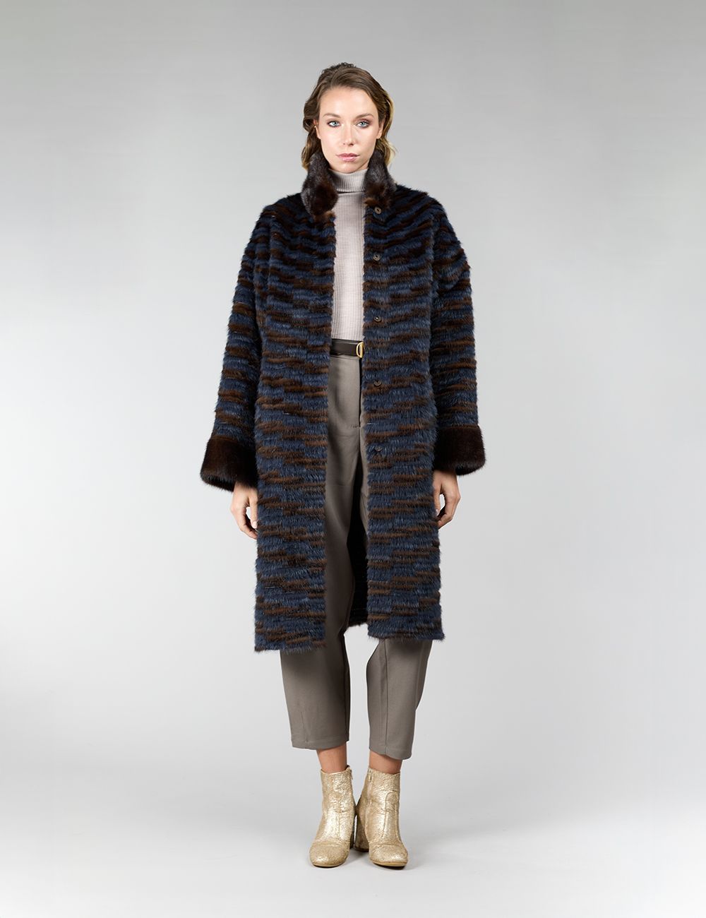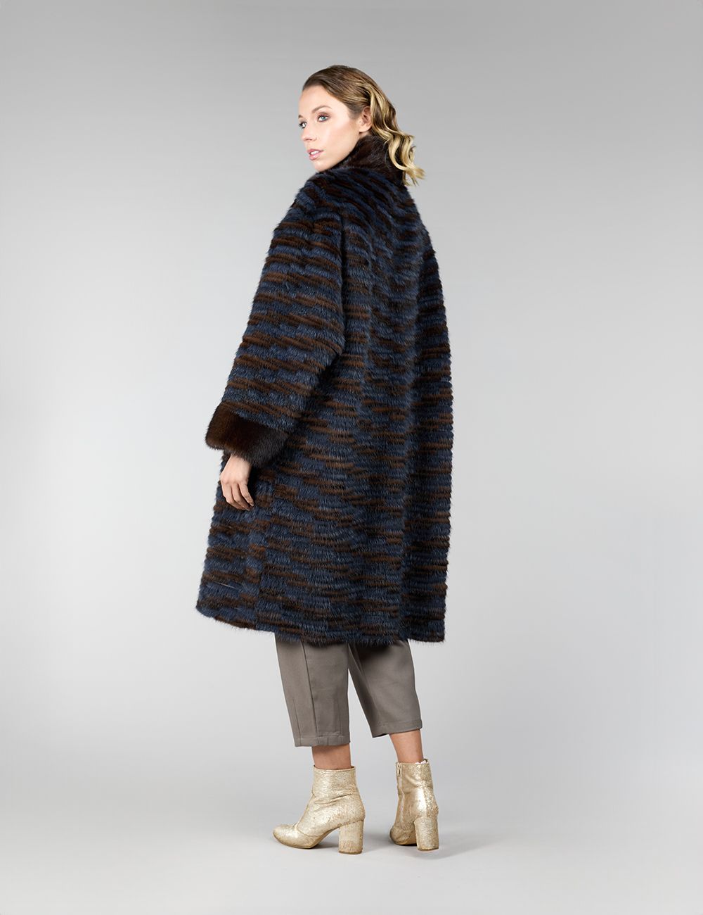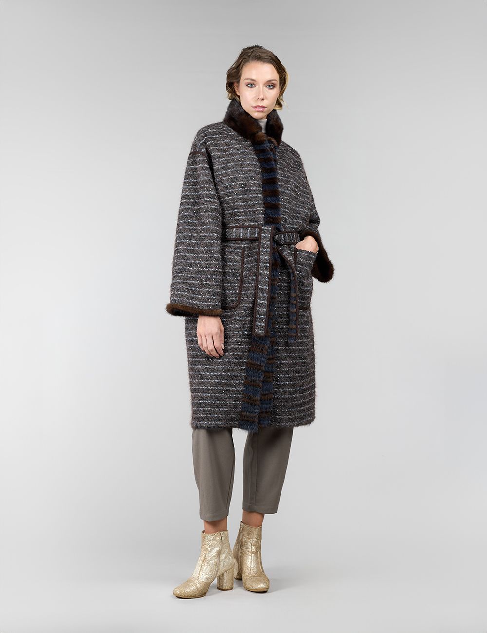 Cappotto reversibile in visone demi buff e tessuto grigio con lavorazione orizzontale, collo alto in visone scuro, maniche con risvolto e bordi in pelliccia, chiusura con bottoni a pressione, tasche applicate su un lato e inserite sull’altro, linea dritta e ampia, 105 cm
