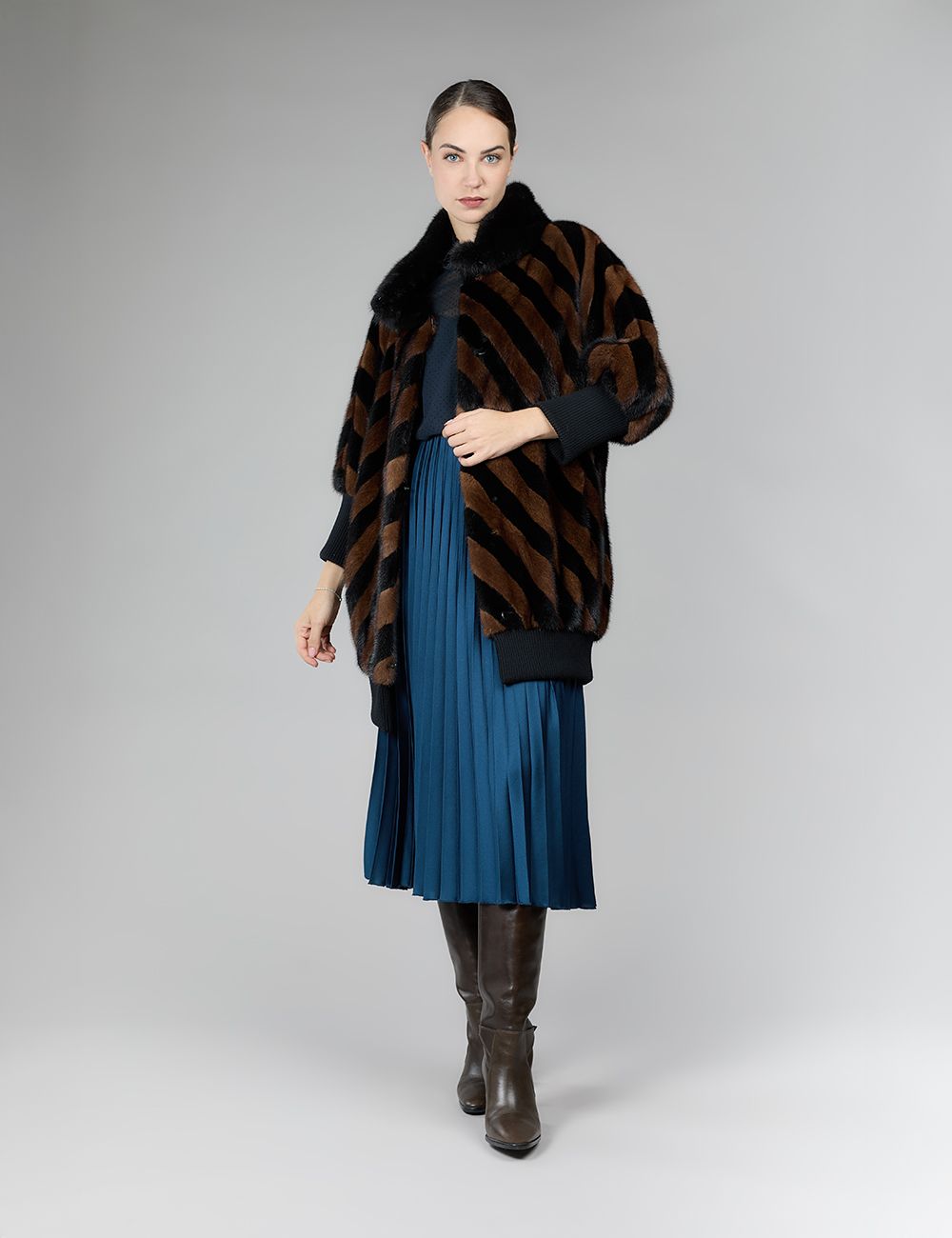 Gilet corto in visone senza collo con dettagli in pelle verde 65cm