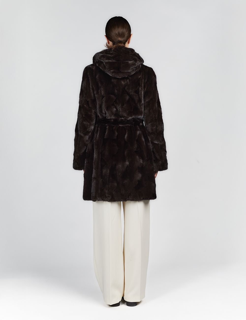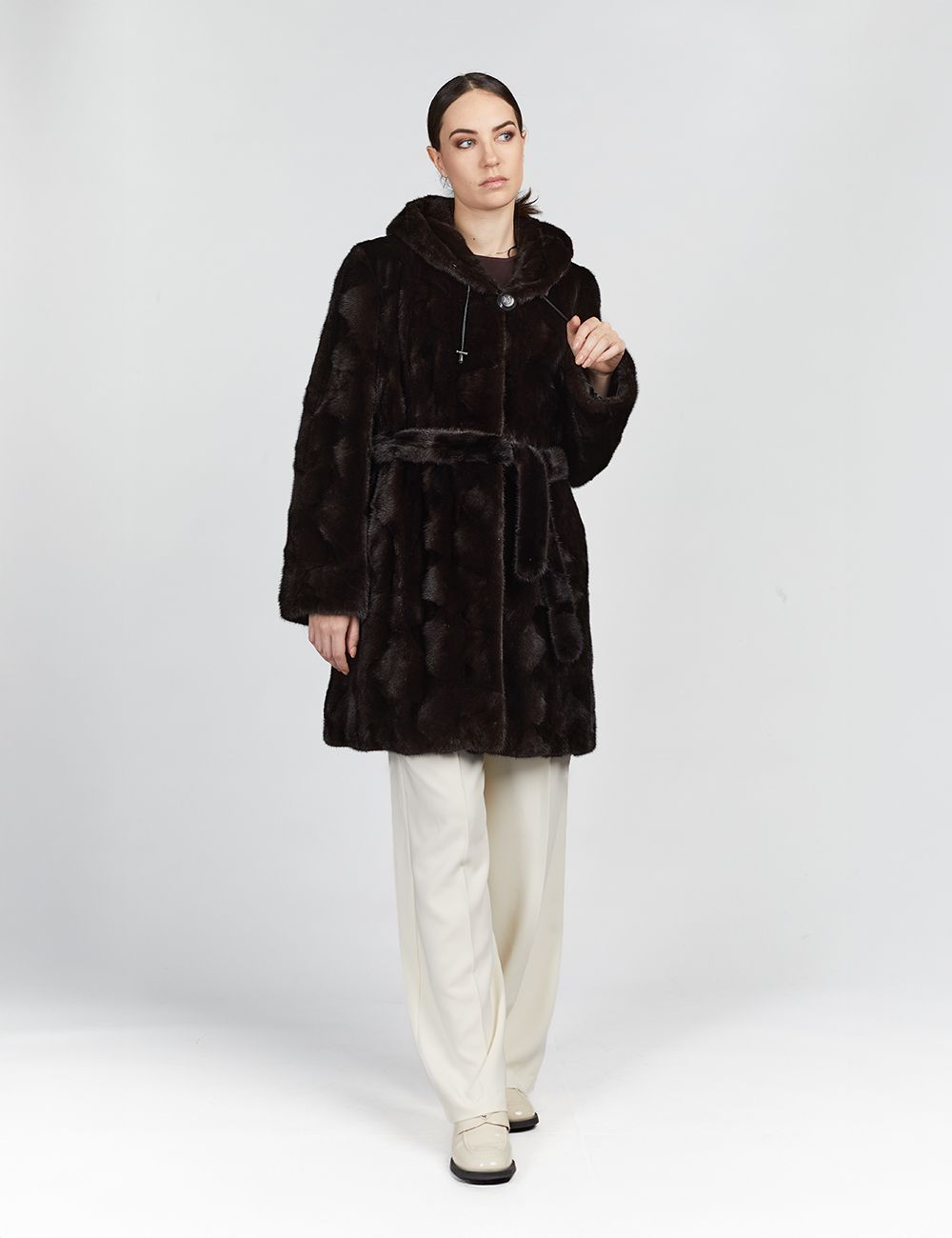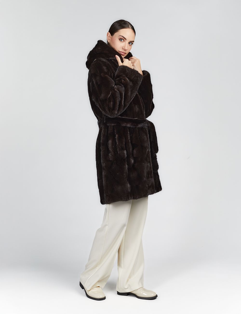 Knee-length mink coat, drawstring hood, waist belt, horizontal workmanship, jewel hook and button closure, loose fit, black, 90cm. For more information, contact us on Whatsapp.