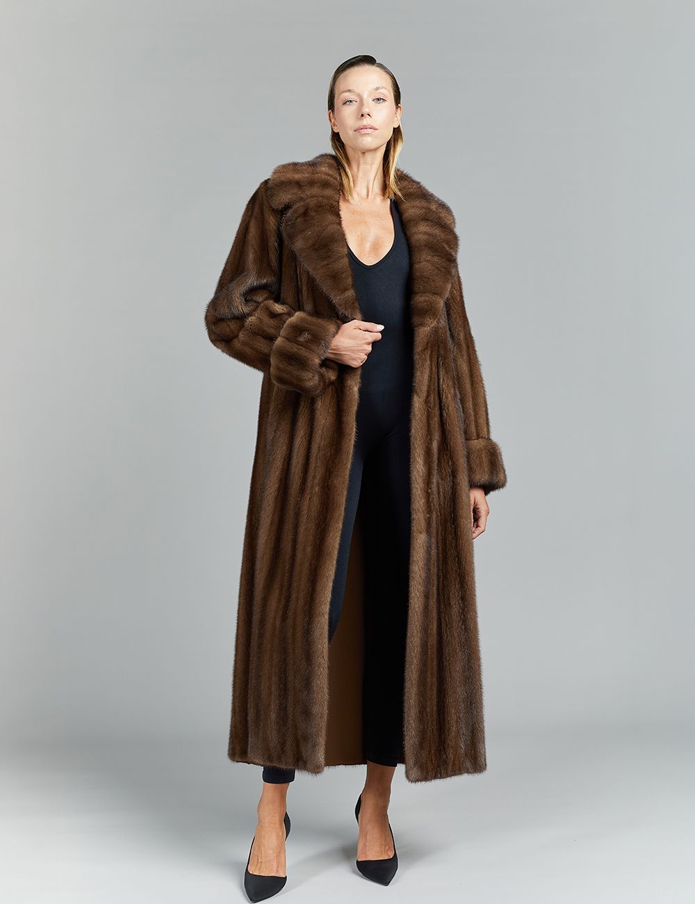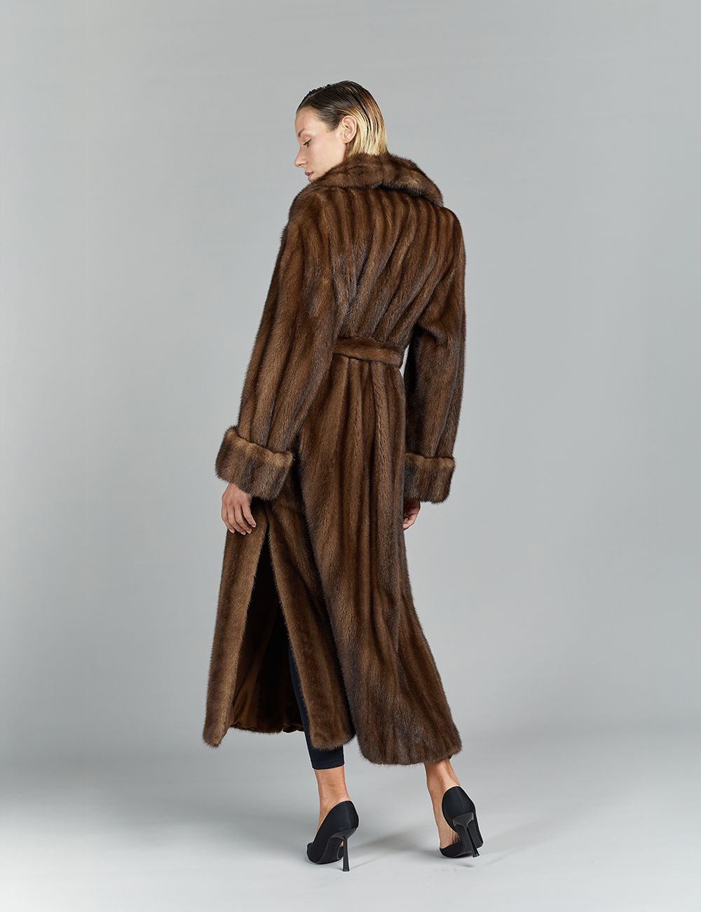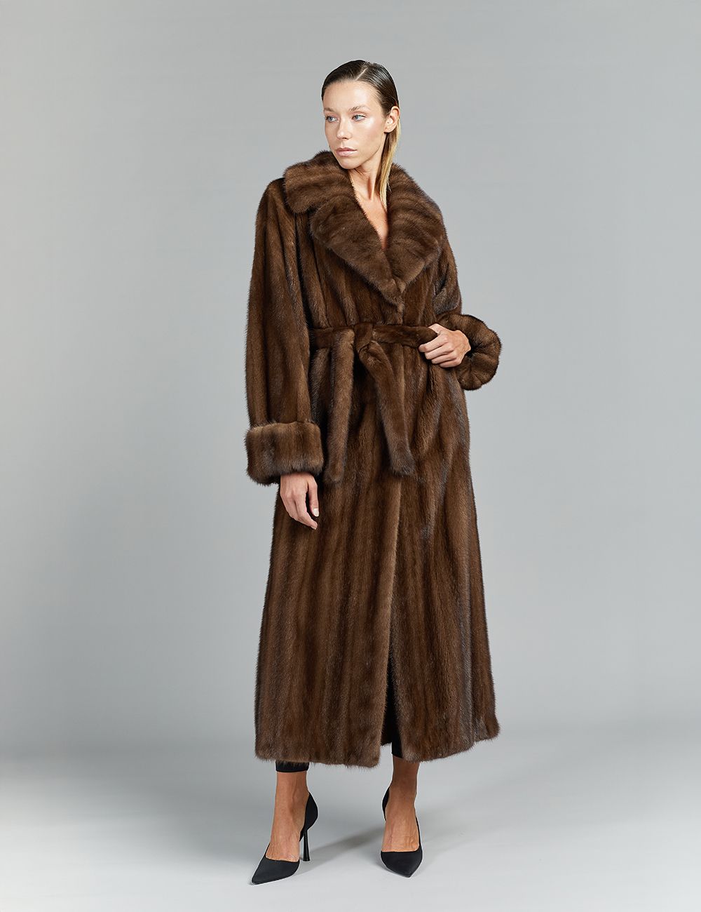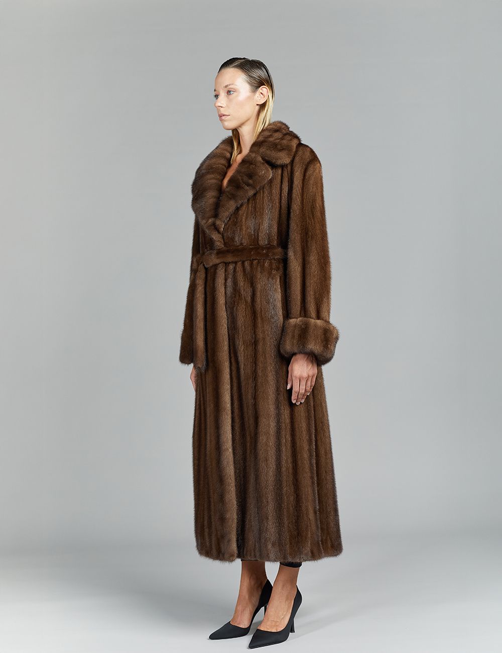 Long mink coat in full leather, English collar, with belt, demi buff, 135 cm.