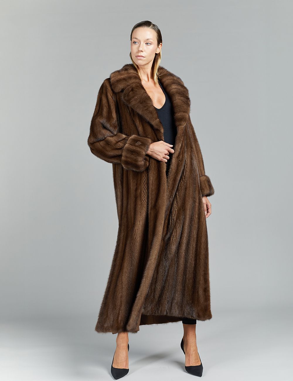Long mink coat, English collar, demi buff, 135 cm.
