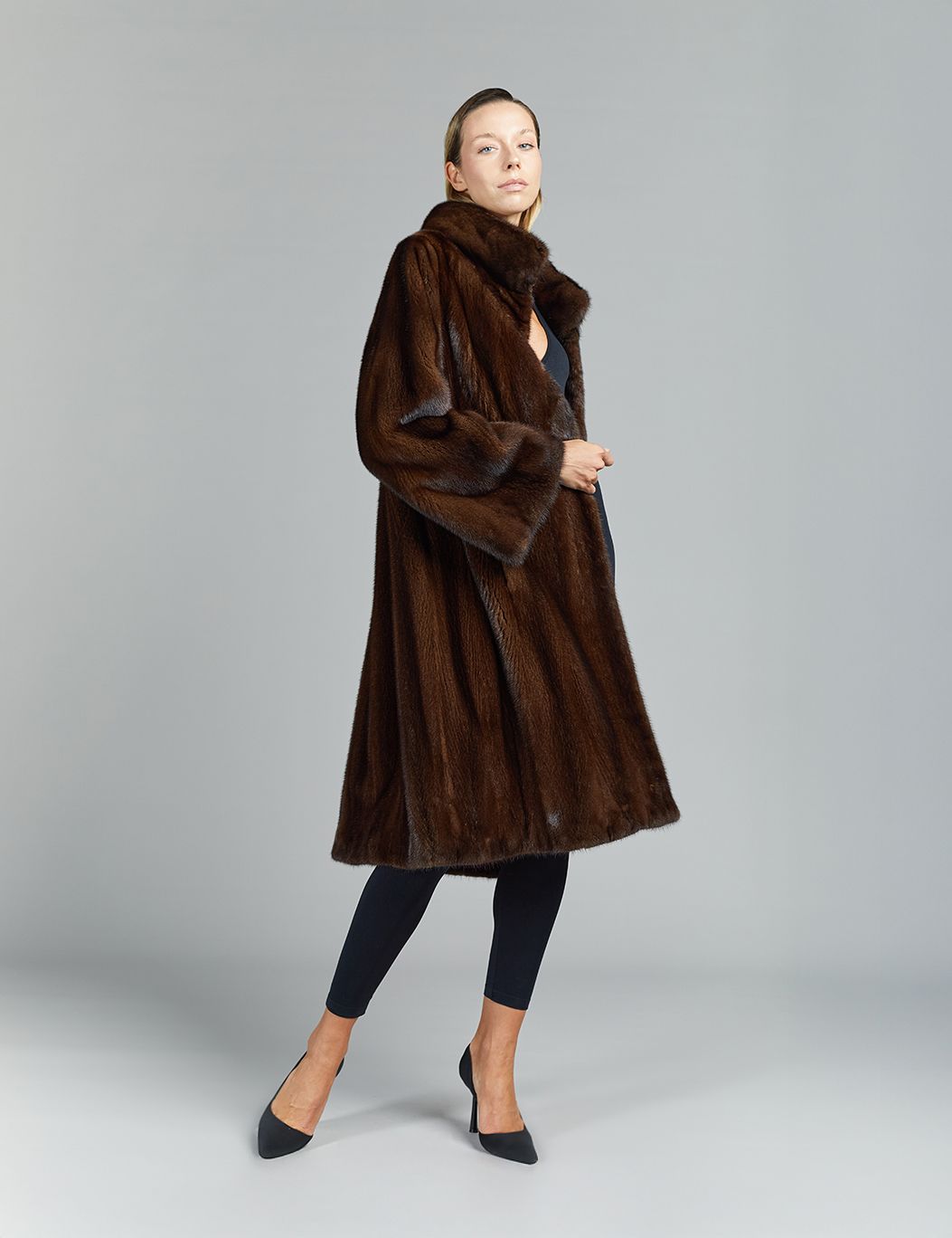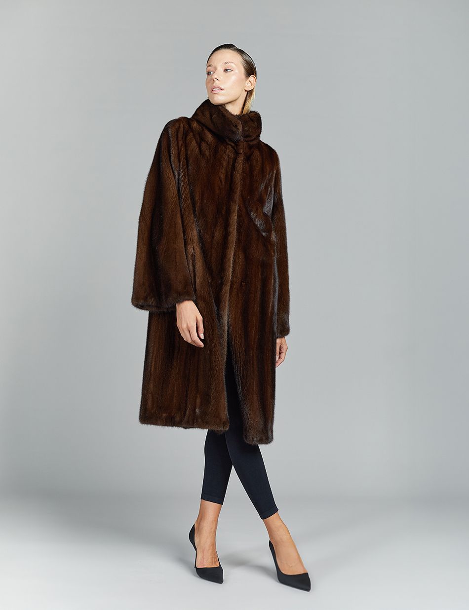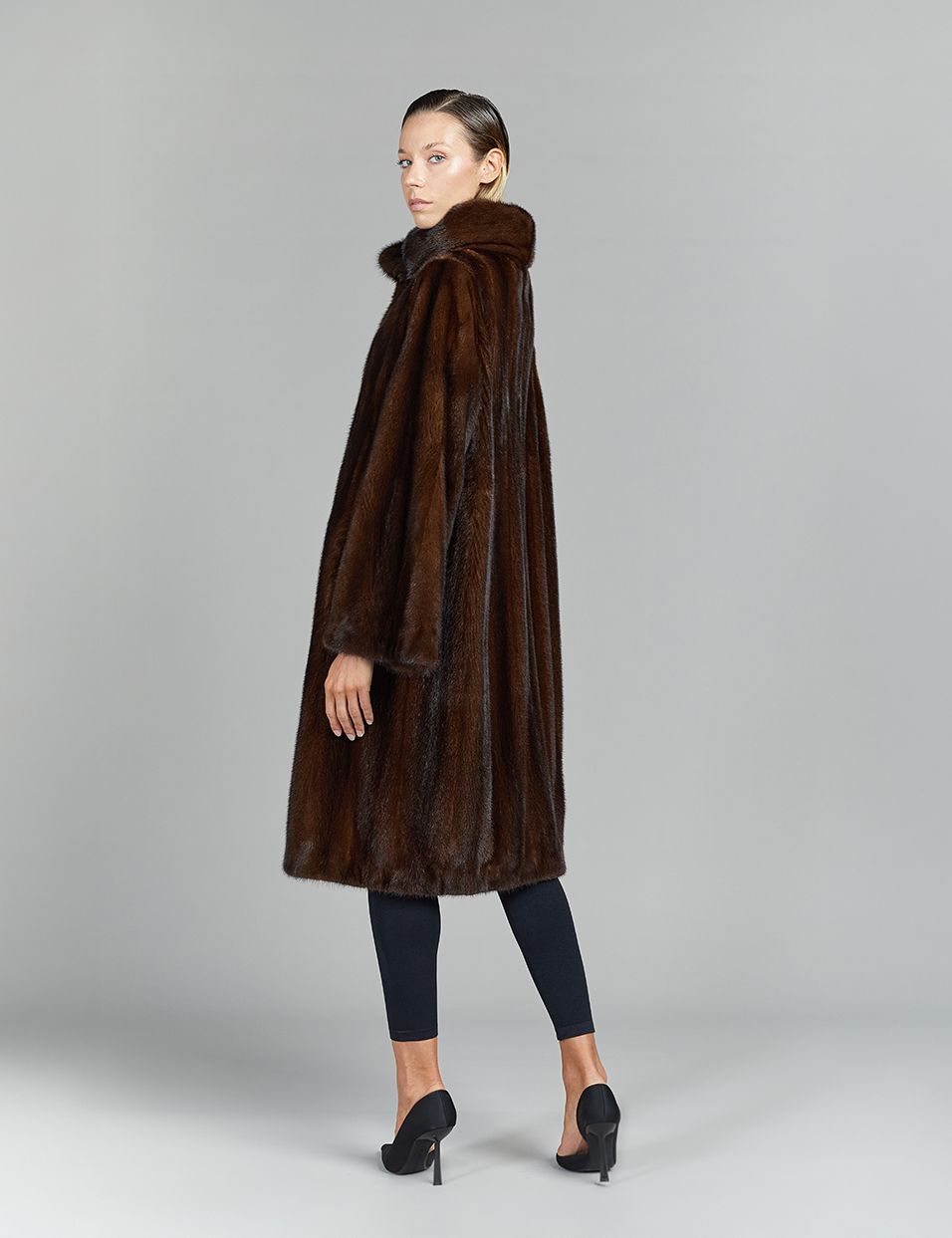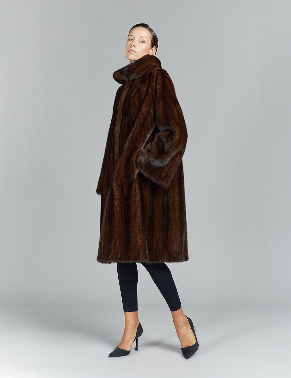 Mink coat with high collar, full leather, flared, mahogany, 105 cm.