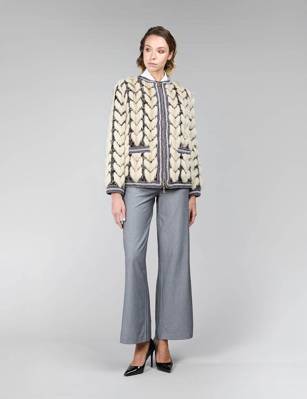 Short Persian coat, hook closure, English collar, mink details, gray, 80cm.