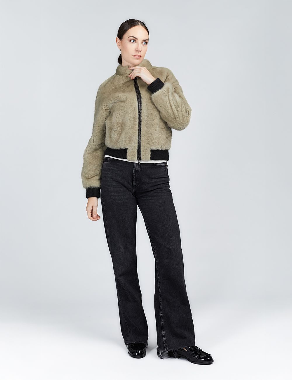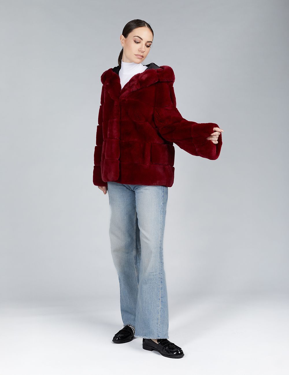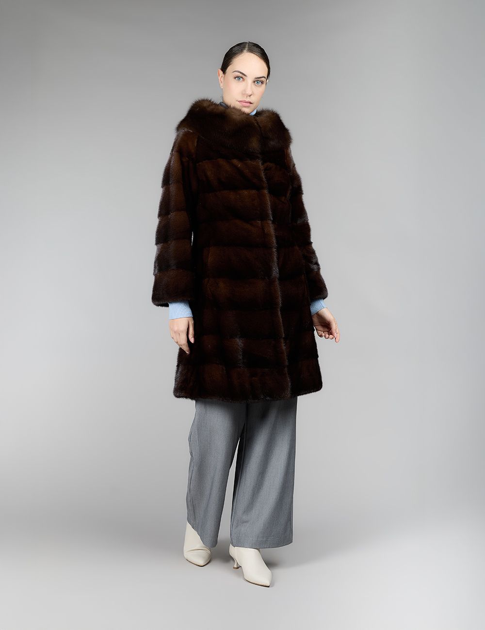 Sheepskin coat, reversible, without collar, patch pockets, anthracite color, 90 cm