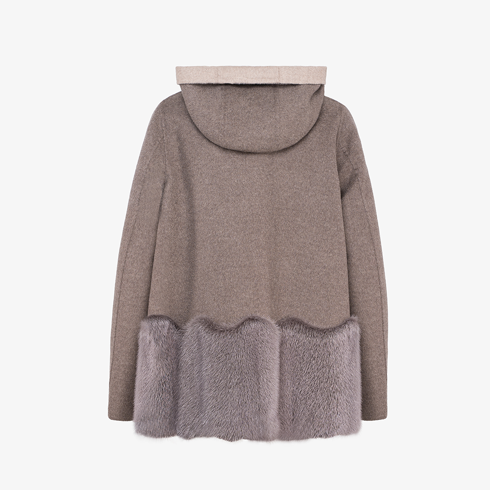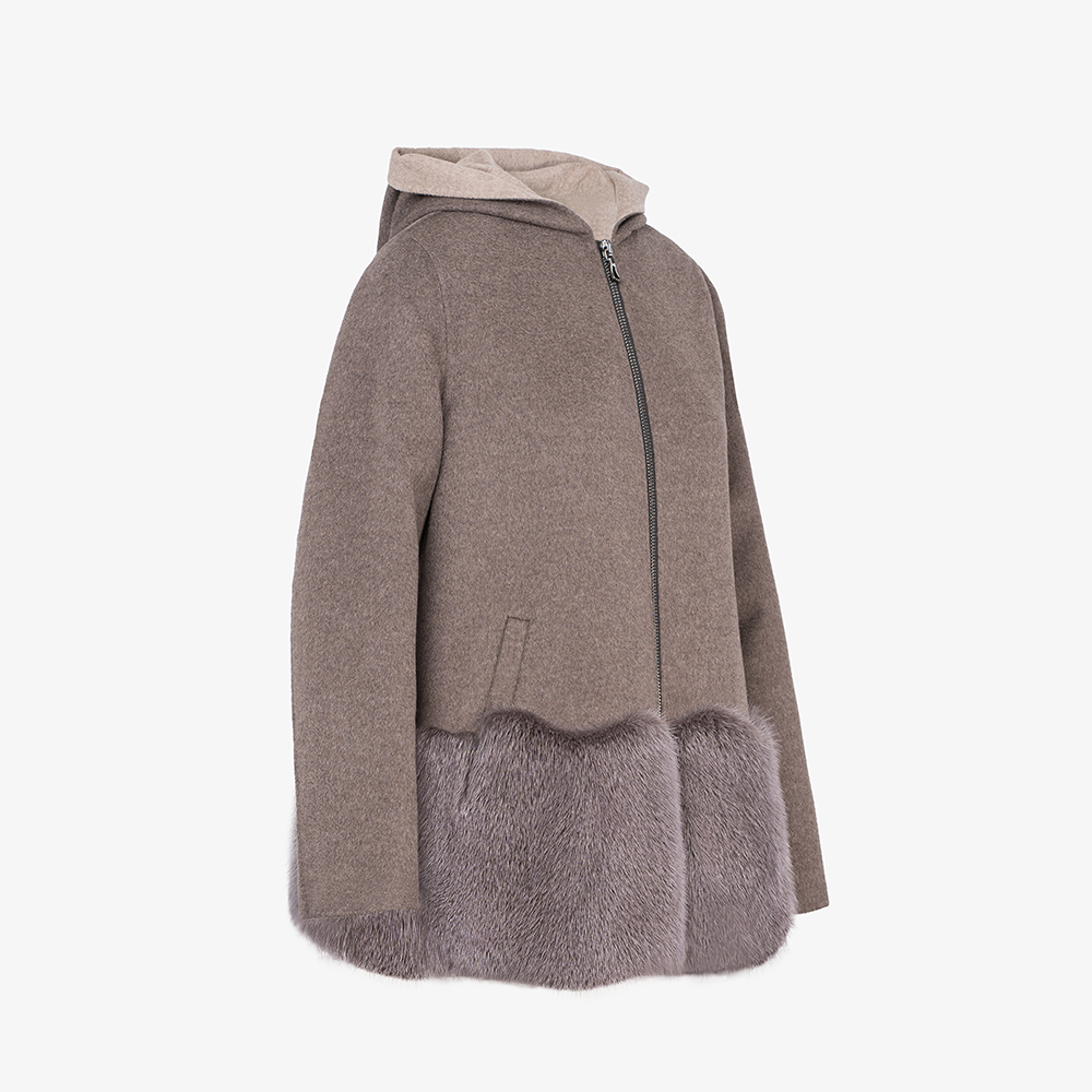 Manteau en cachemire avec capuche et bordure vison boue 70 cm