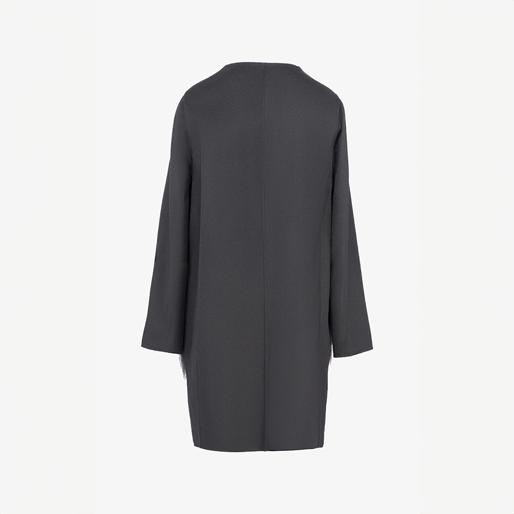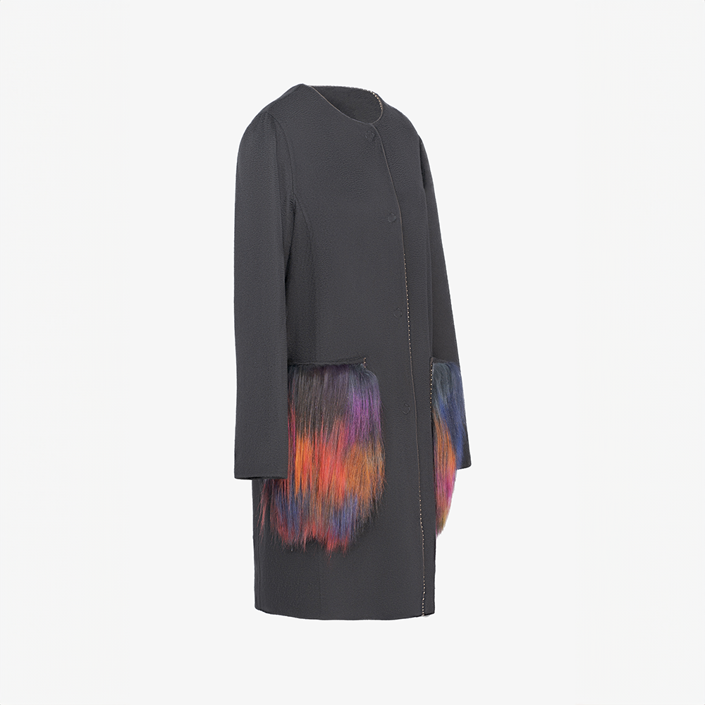 Manteau en cachemire sans col avec poches appliquées en fourrure de kidassia noir de 95 cm.