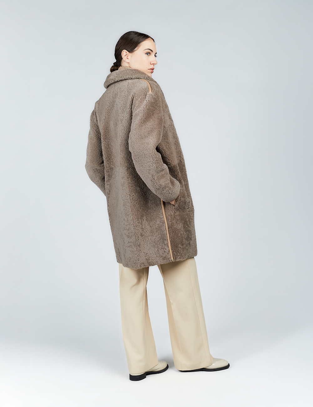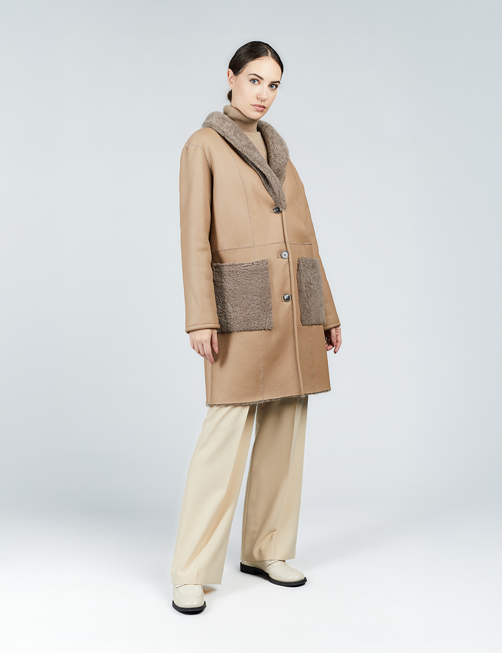 Manteau en peau de mouton réversible avec poches appliquées cognac de 90 cm.