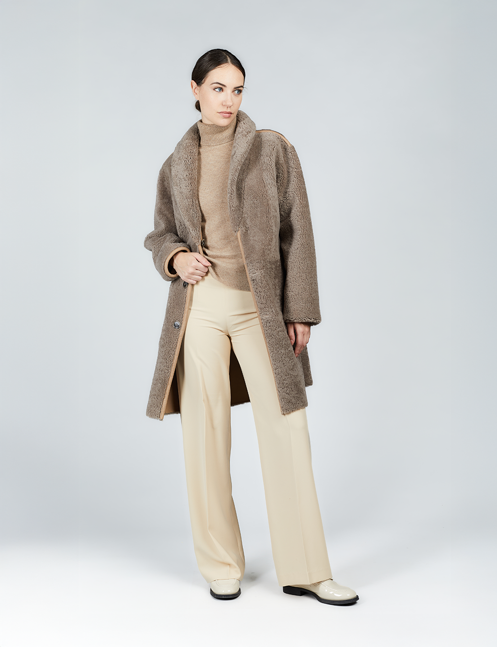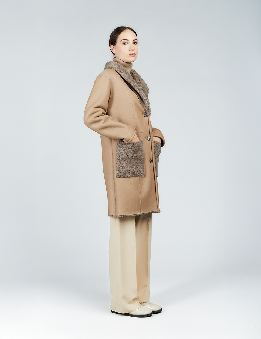 Manteau en peau de mouton, réversible, poches plaquées, cognac, 90 cm