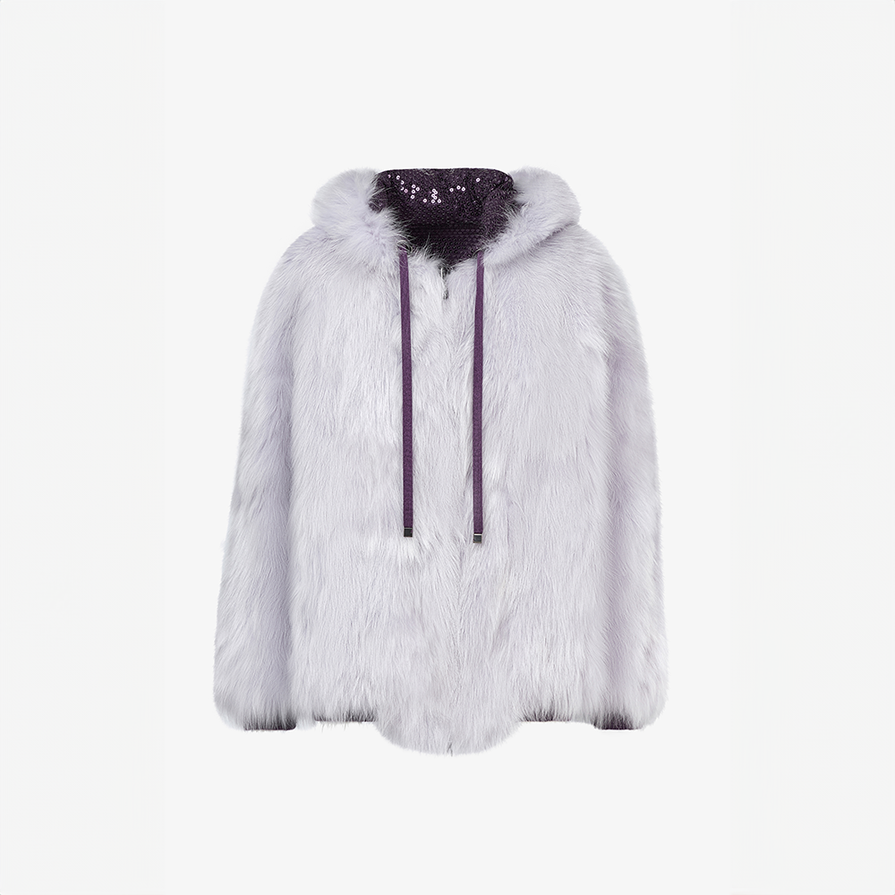 Veste courte en persan et renard avec fermeture éclair réversible bleue de 55 cm.