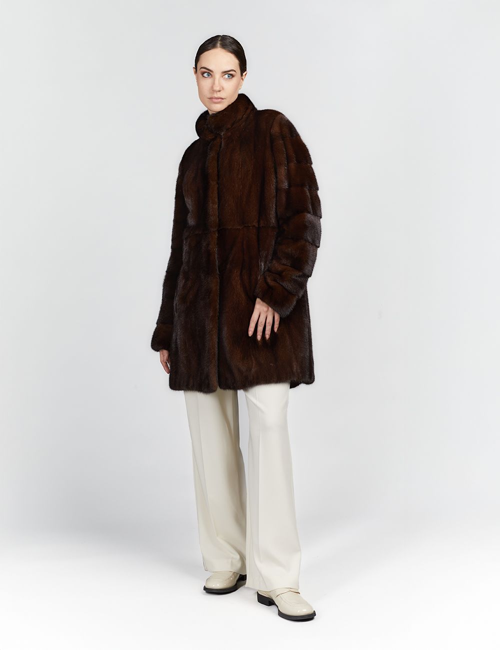 Cappotto en persan, capuche, coupe slim ajustée à la taille, noir, fermeture par crochets, 90cm