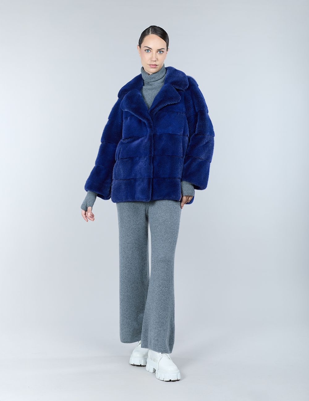 Veste courte en persan avec col en renard et ceinture noire de 60cm.