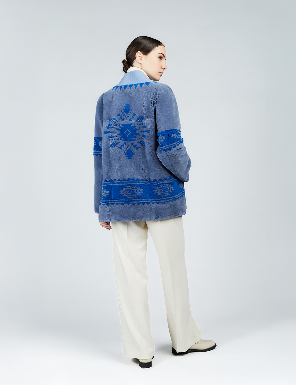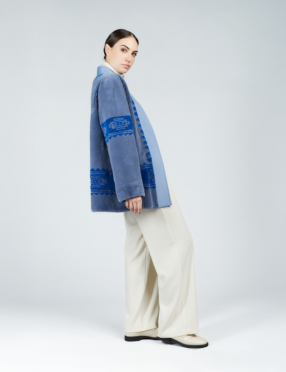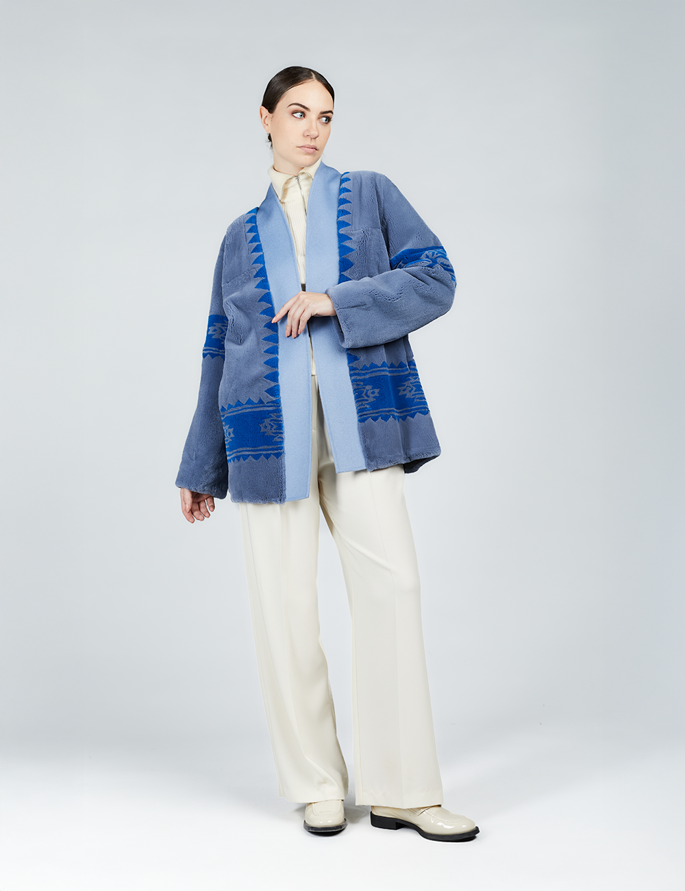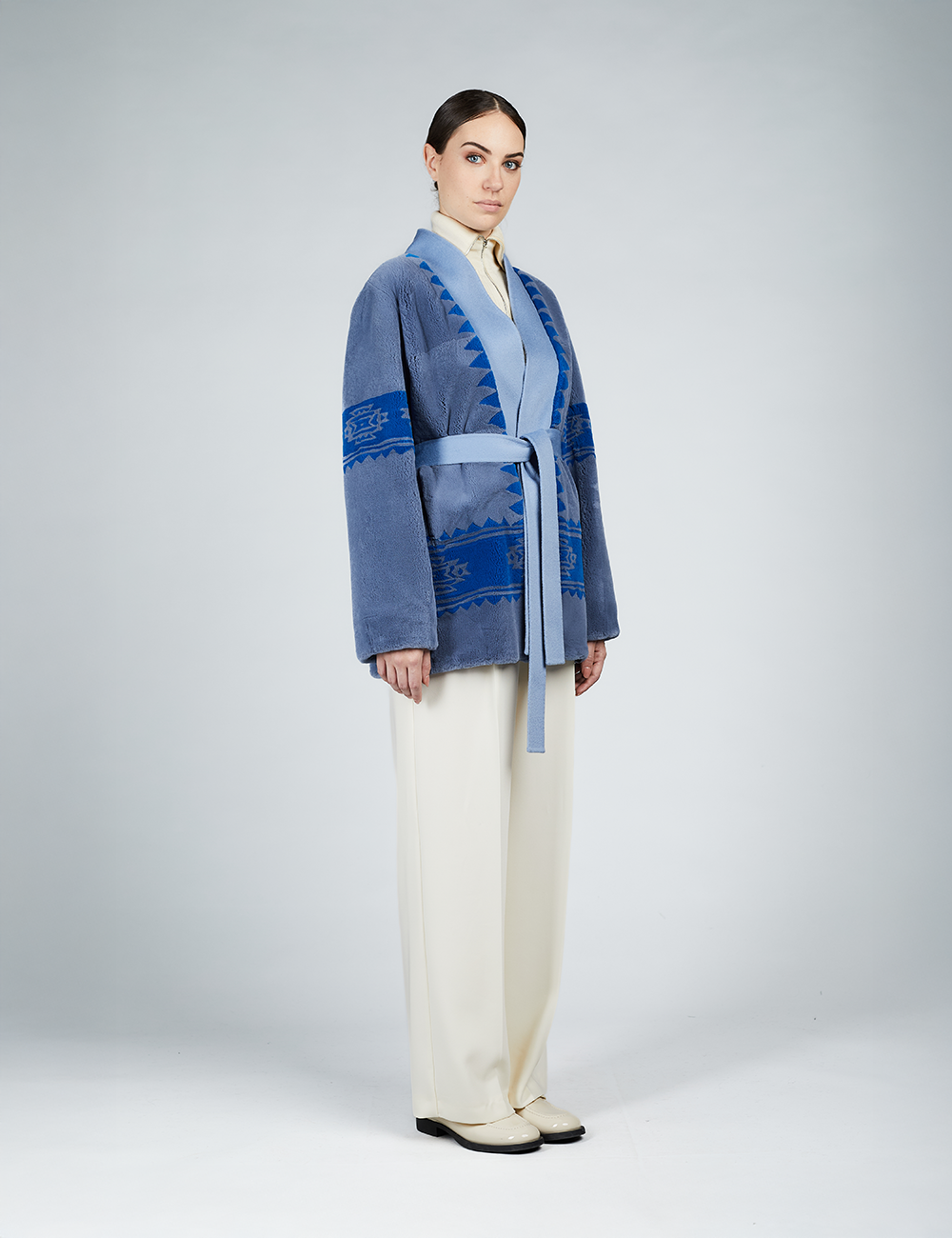 Cardigan en rex avec imprimé tribal et ceinture bleue de 75 cm