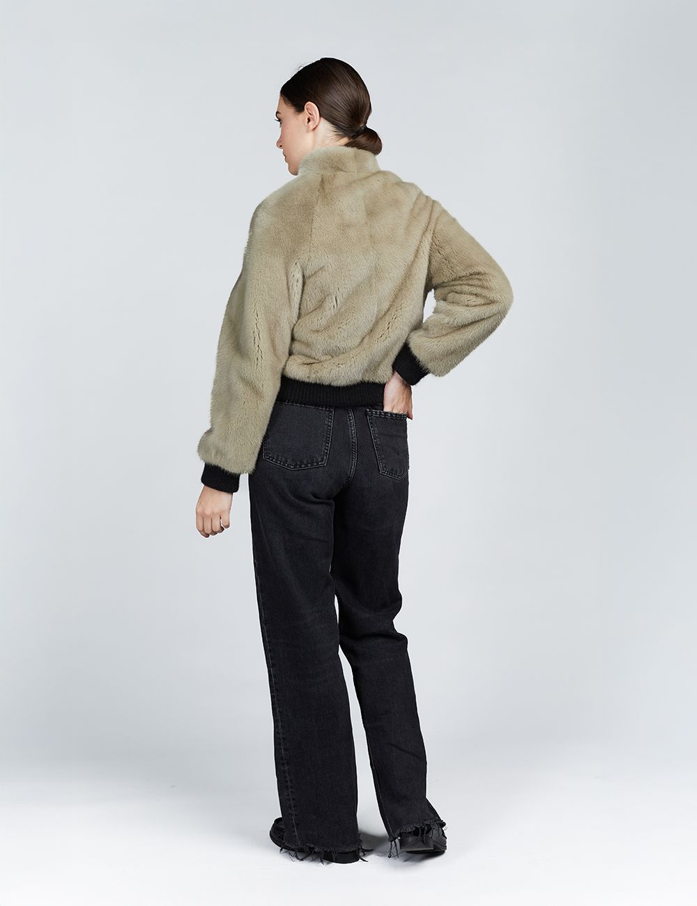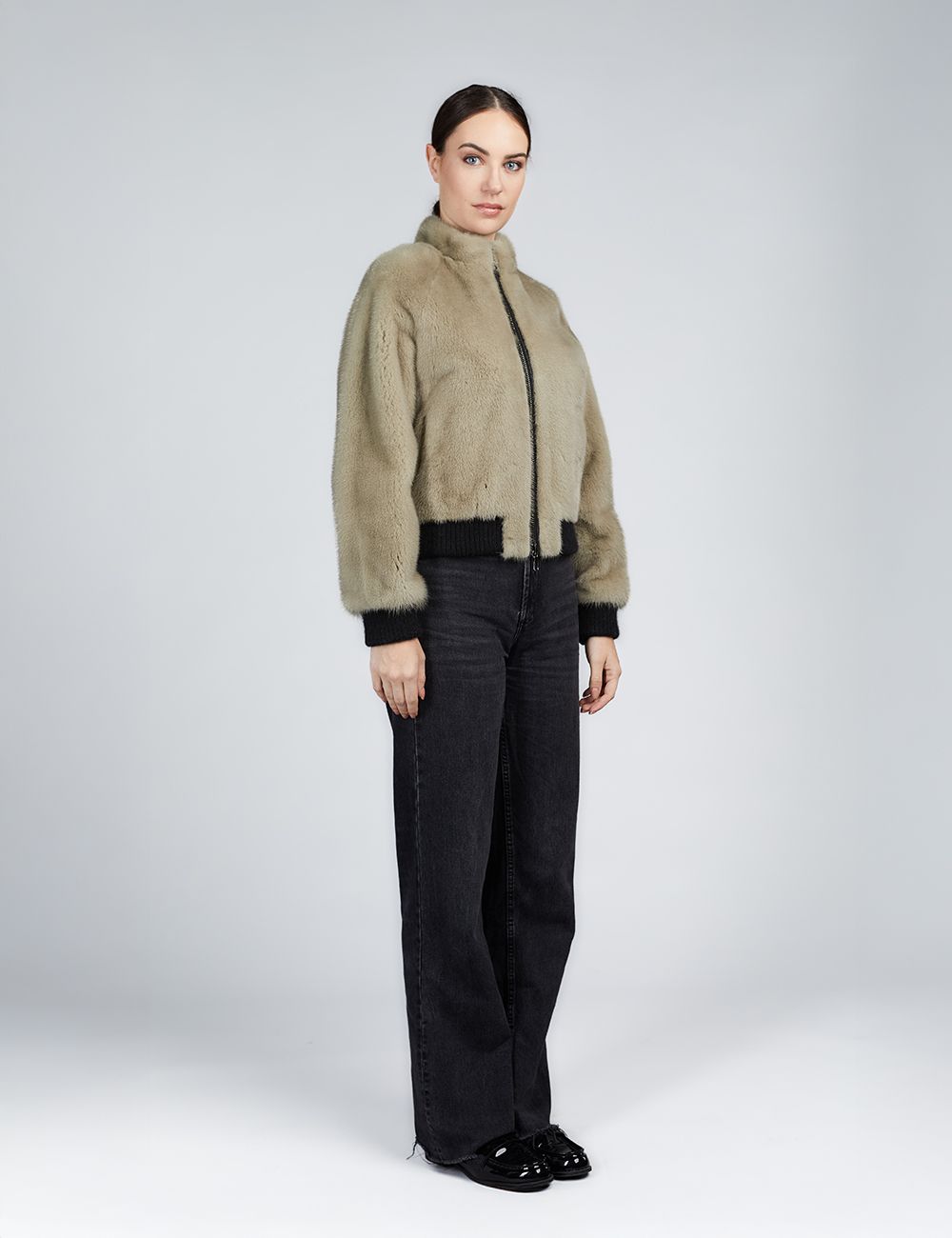 Bomber en vison, fermeture éclair, poignets en laine, vert olive, 55 cm