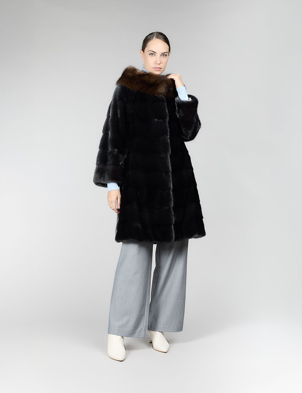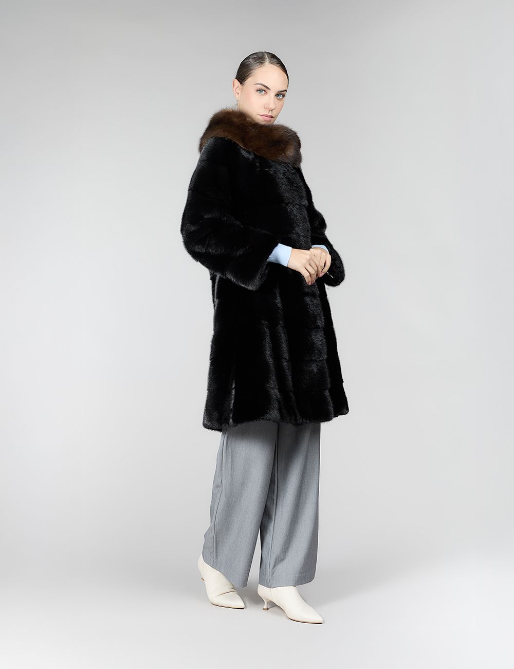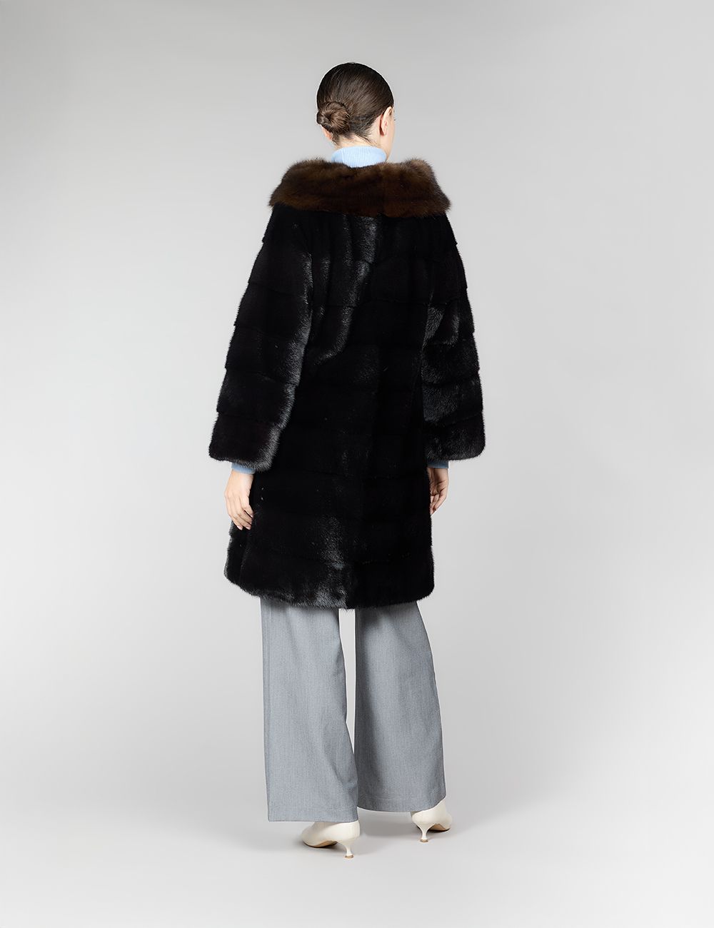 Manteau vison, col large martre, travail horizontal, noir, 90 cm