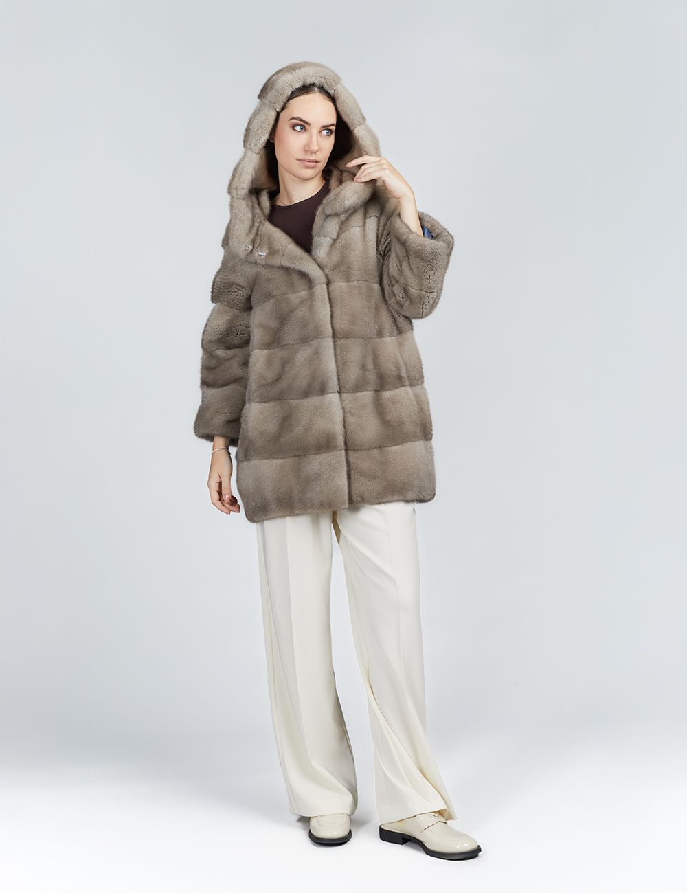 Manteau en vison avec intarsia géométrique réversible de 90 cm