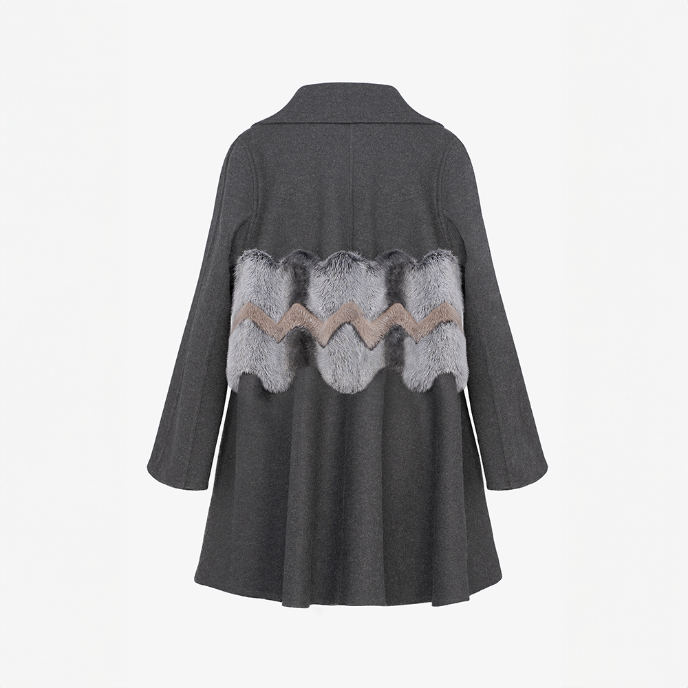 Cappotto ampio in cashmere Loro Piana, dettagli in visone, collo inglese, colore grigio scuro, 80 cm