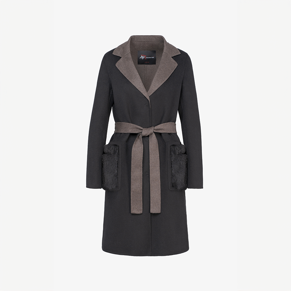 Cappotto lungo in cashmere con bordo in visone e cintura panna 130 cm