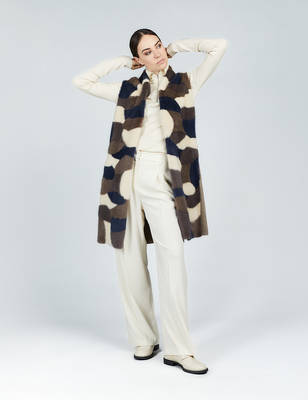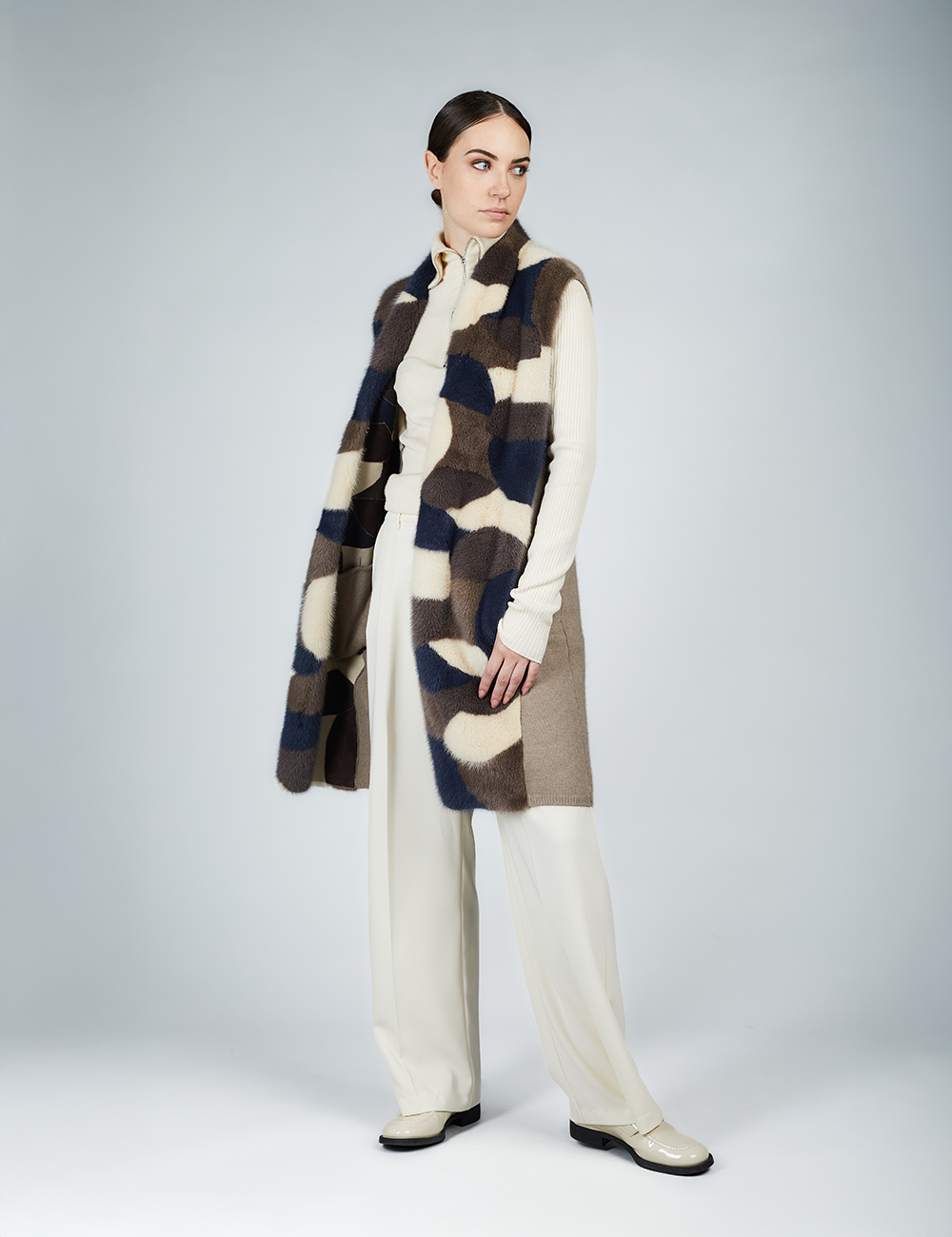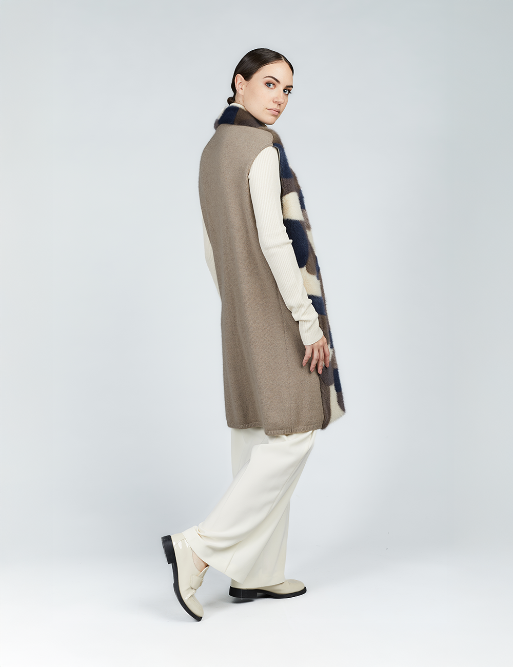 Gilet in cashmere senza collo con finiture in visone multicolore 90 cm