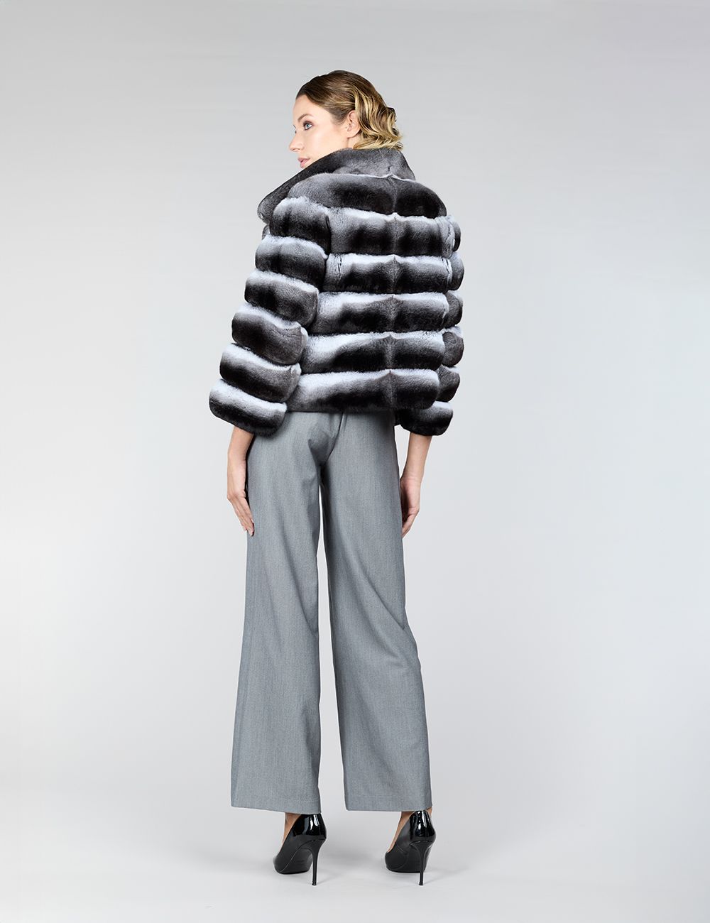 Giacca corta in cincillà naturale con lavorazione orizzontale, collo alto, manica lunga, chiusura con ganci, linea leggermente svasata, 50 cm