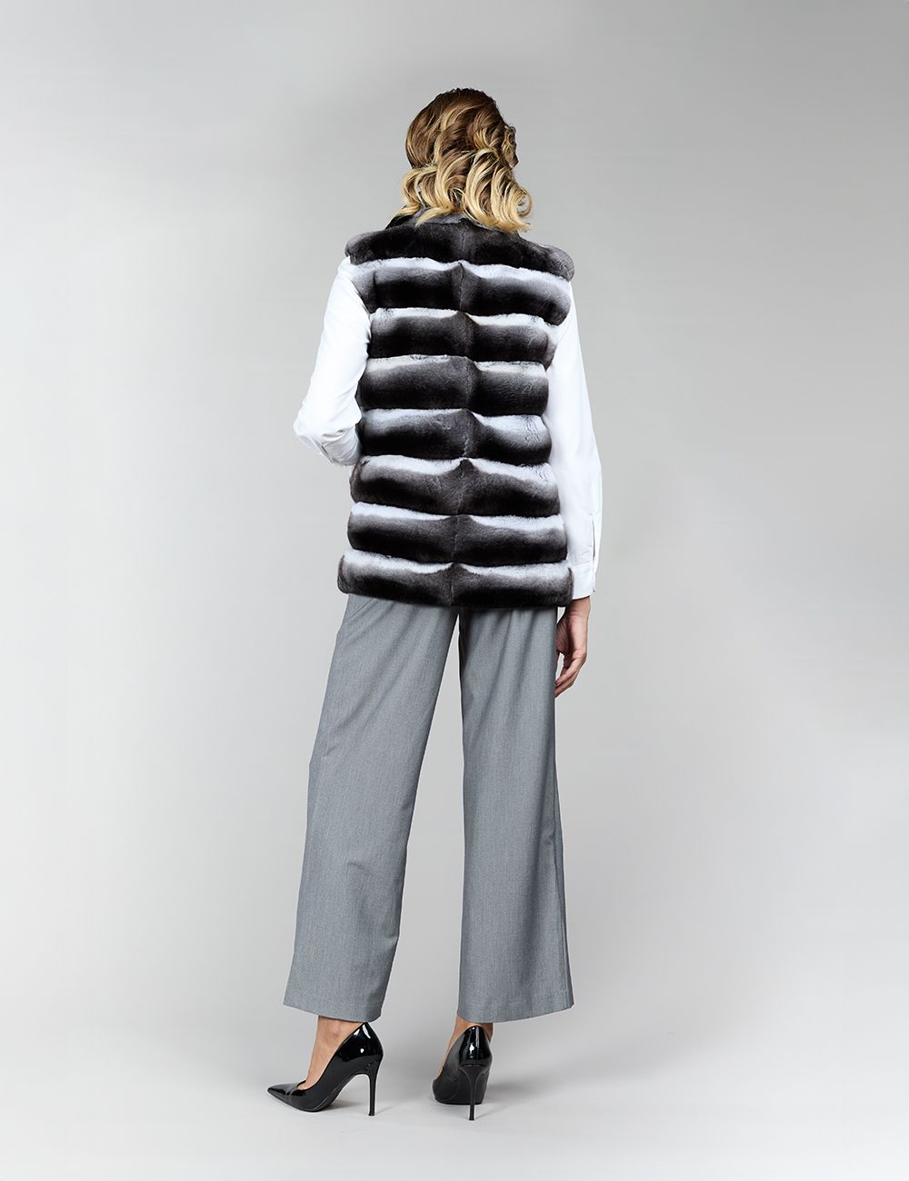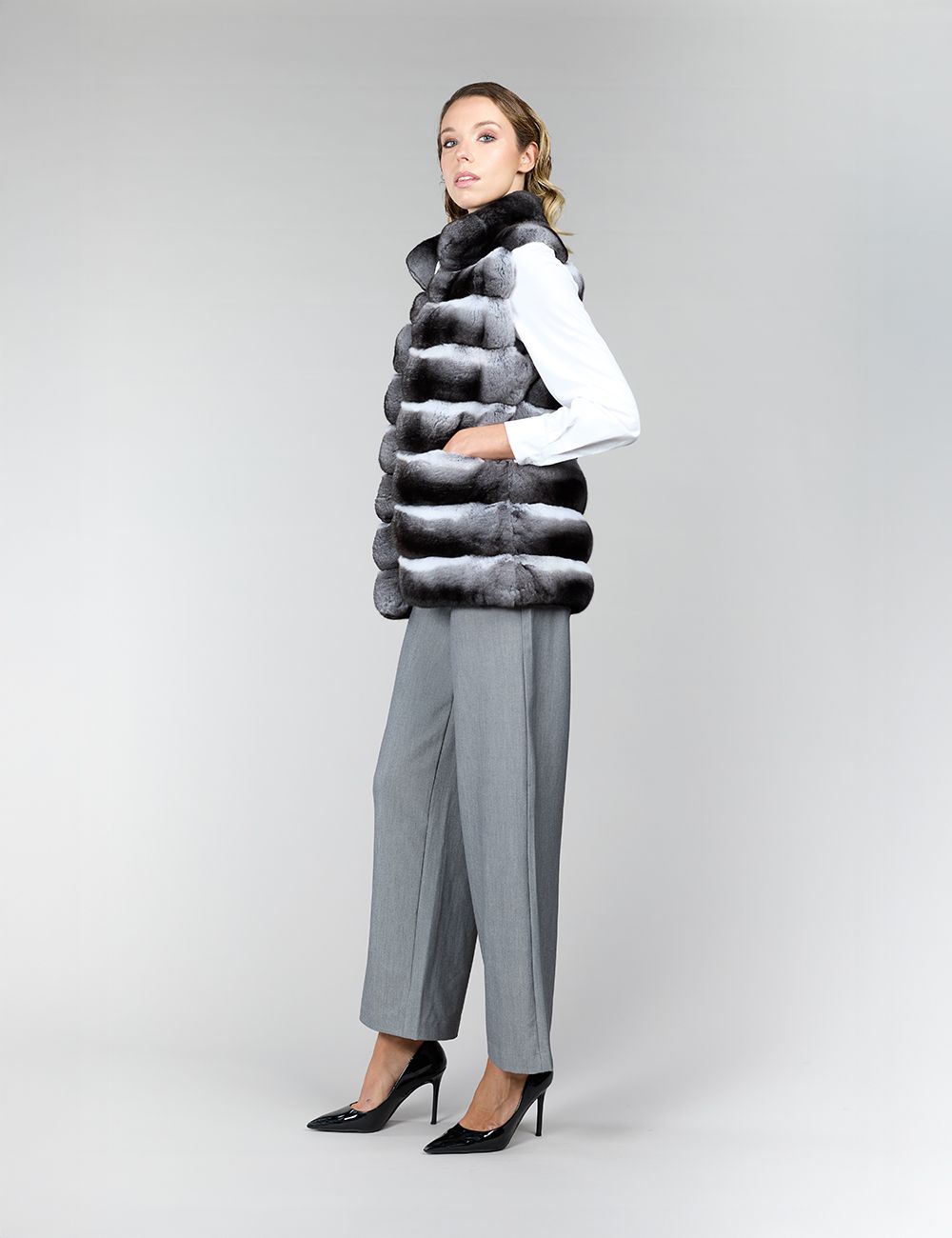 Gilet in cincillà naturale, collo alto avvolgente, chiusura con ganci invisibili, tasche laterali a filo, linea dritta e raffinata, 70 cm