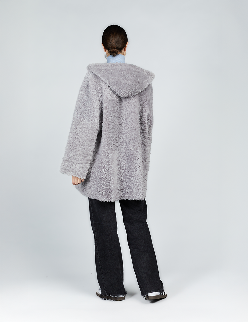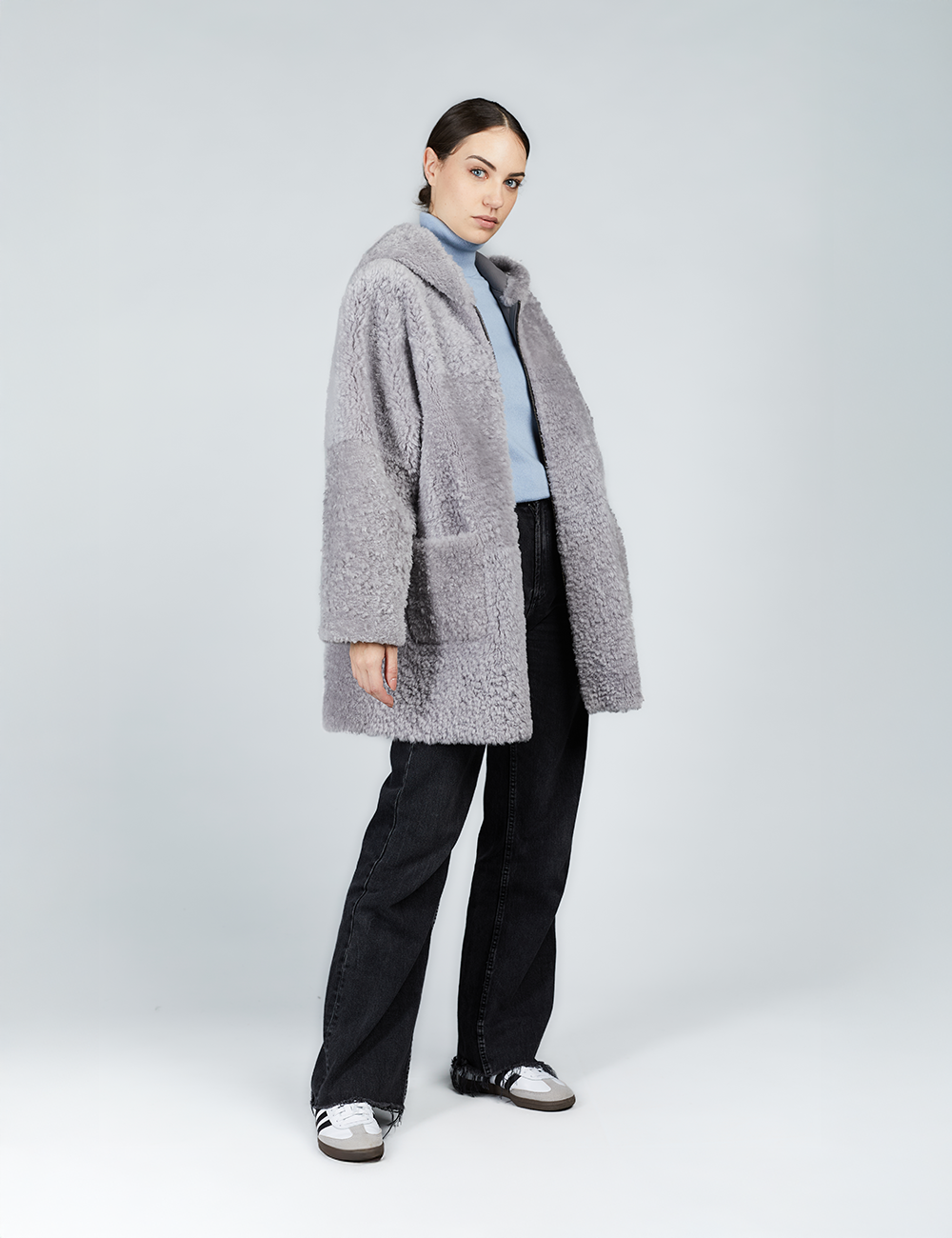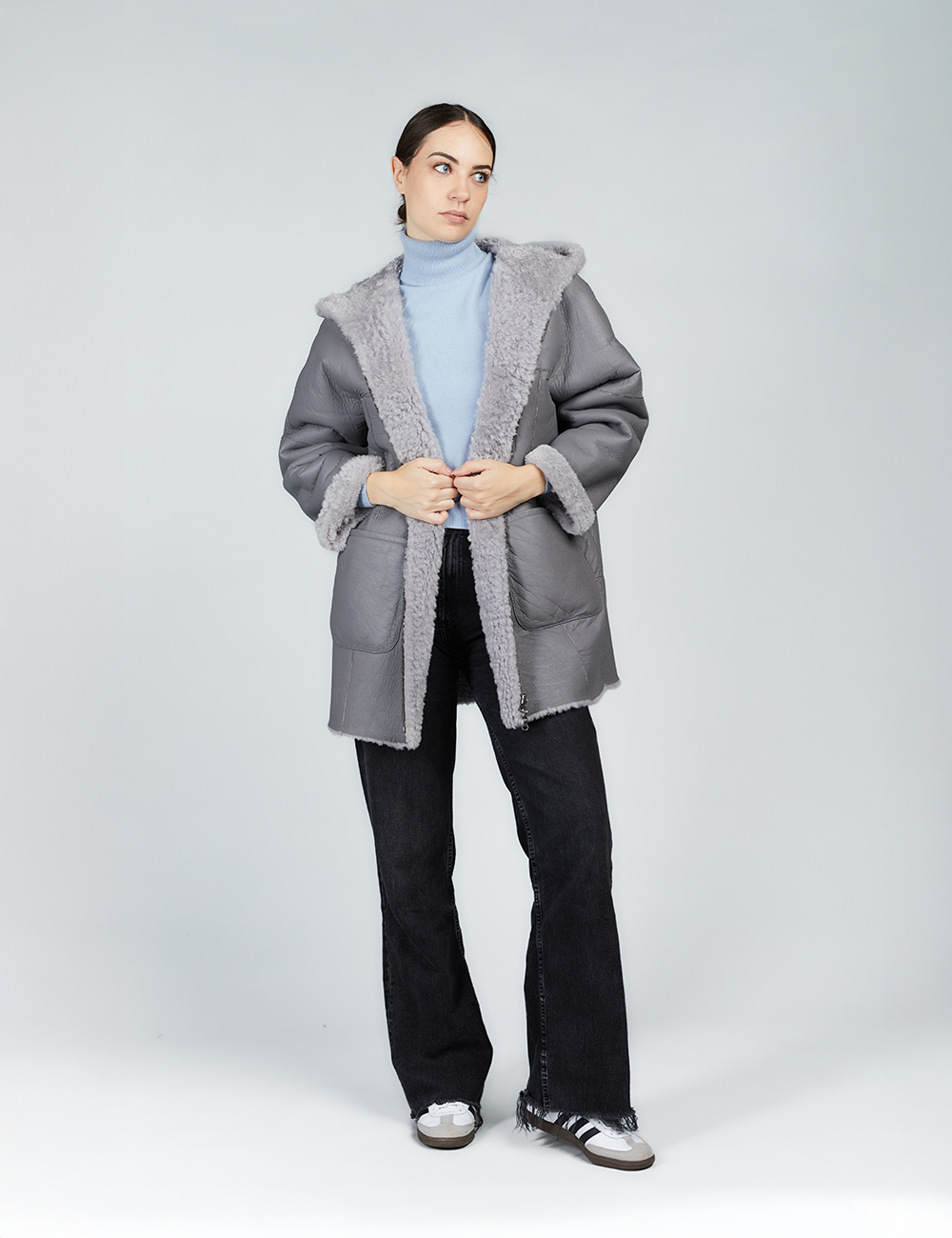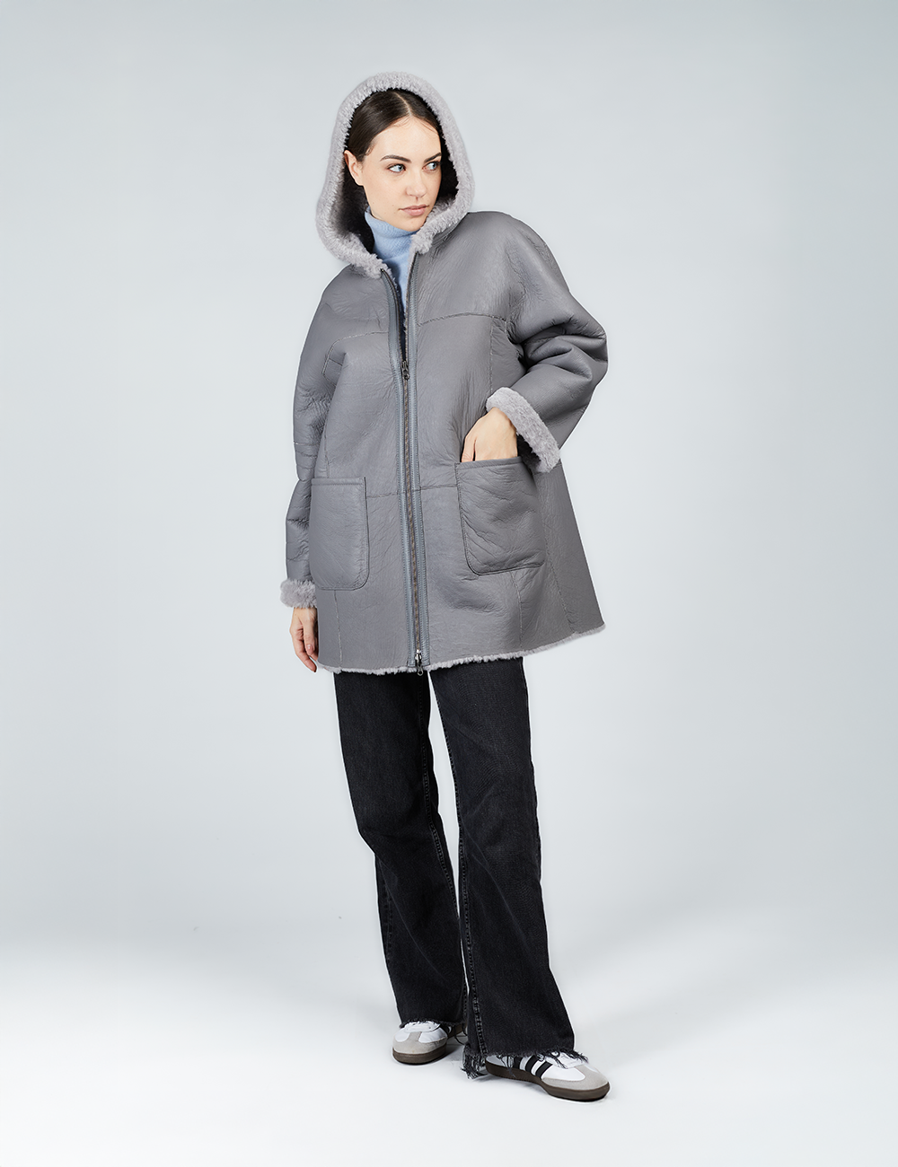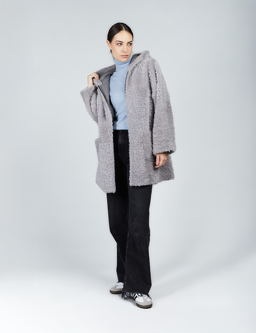 Cappotto di montone, cappuccio, reversibile, grigio chiaro, 80cm