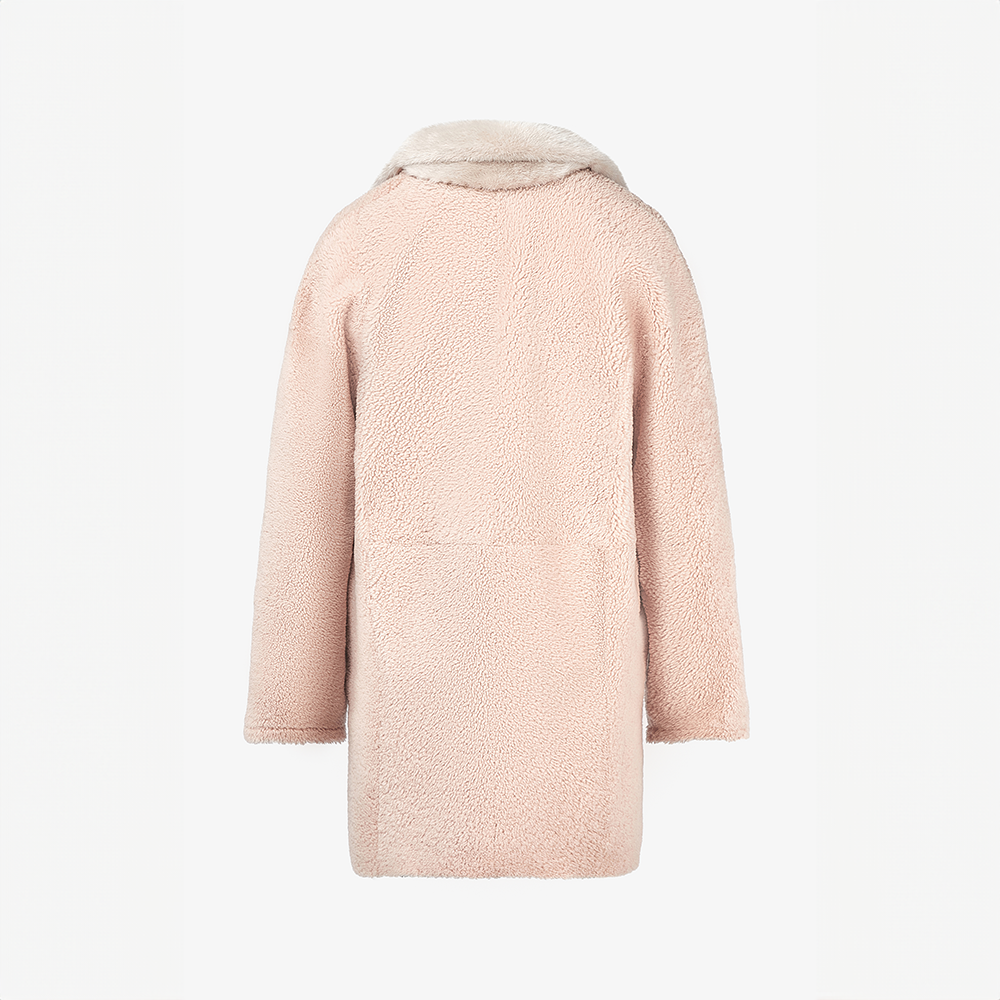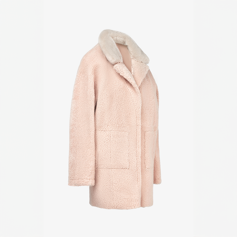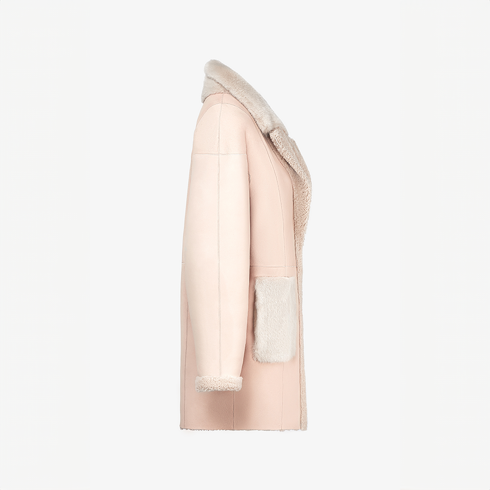 Cappotto di montone, reversibile, collo inglese, tasche in visone, pesca, 80 cm