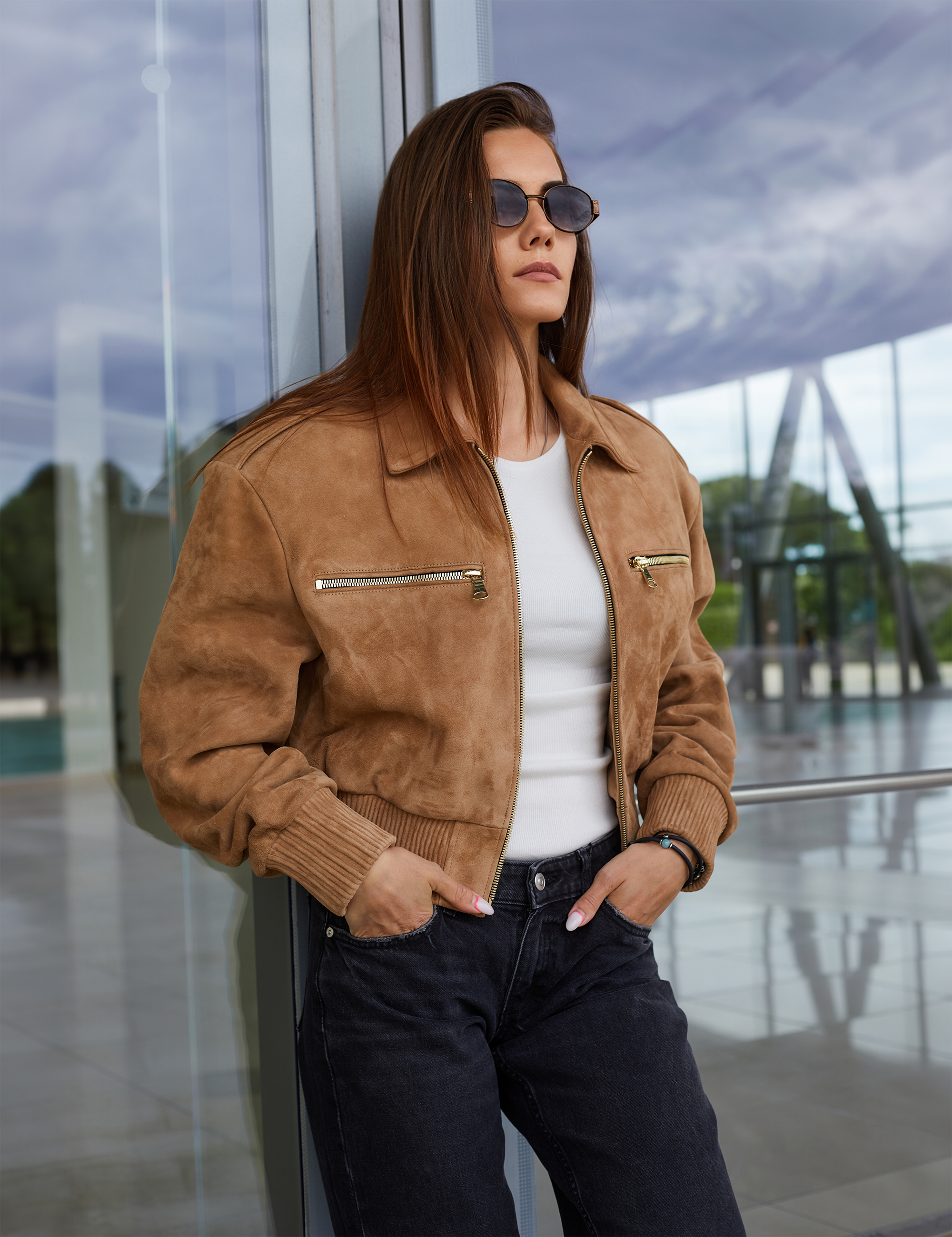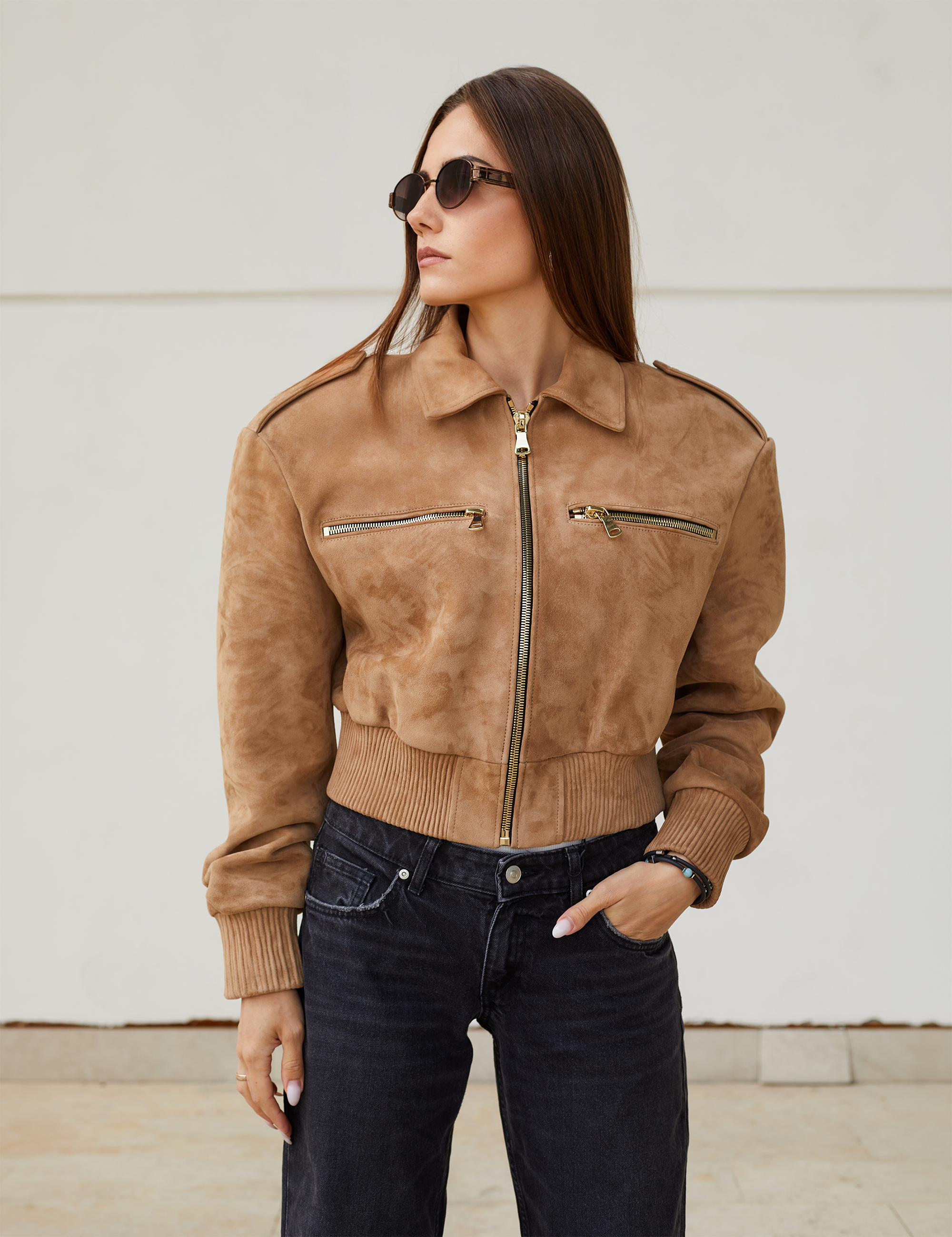Bomber crop di camoscio con elastico e zip cammello 45 cm