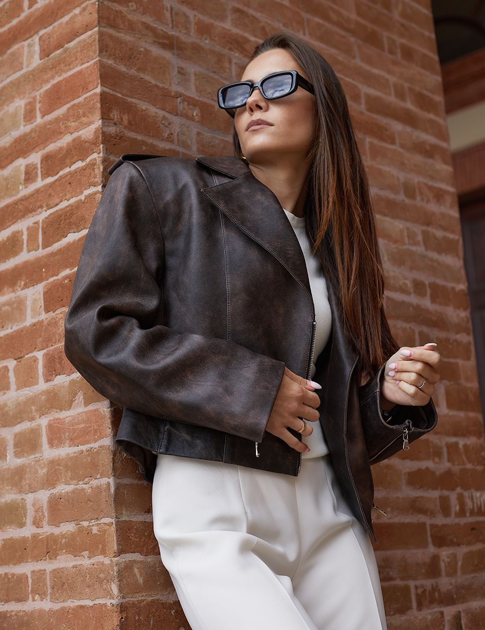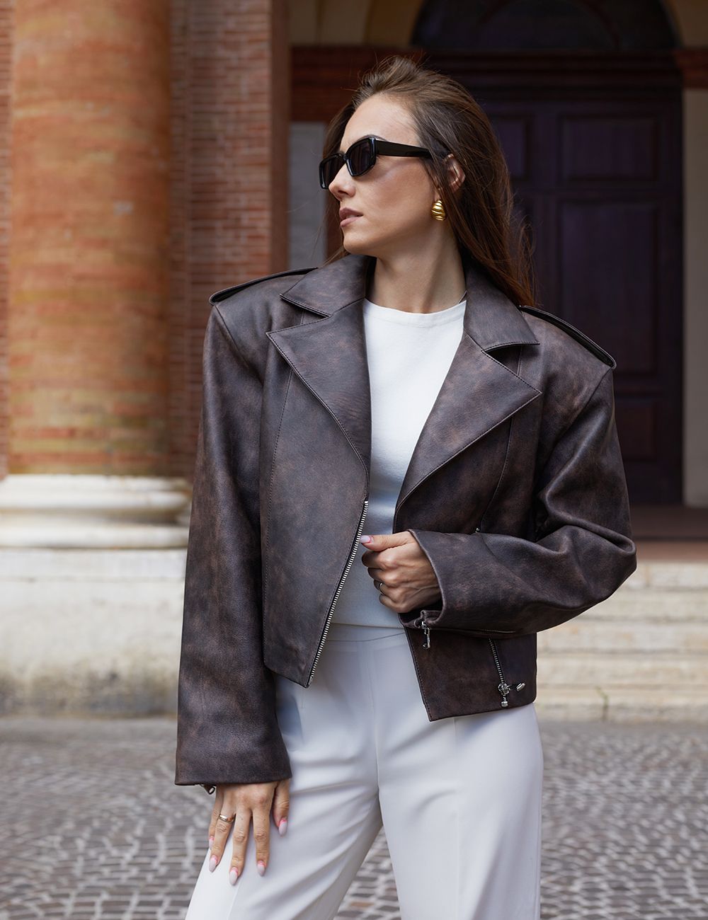 Chiodo crop di pelle, chiusura con zip, fit oversized, effetto vintage, marrone, 50cm