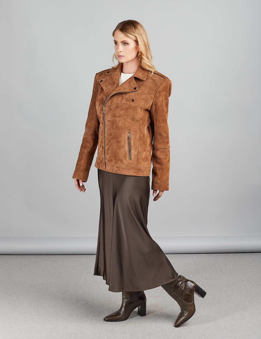 Chiodo di camoscio, cintura removibile in vita, tasche frontali, slim fit, chiusura con zip, cognac, 65 cm
