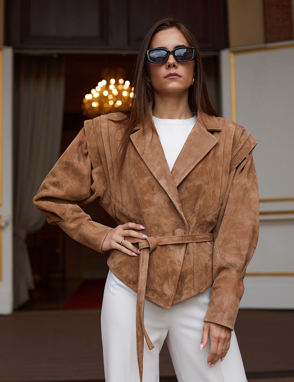 Giacca di camoscio con cintura in vita cammello 60 cm