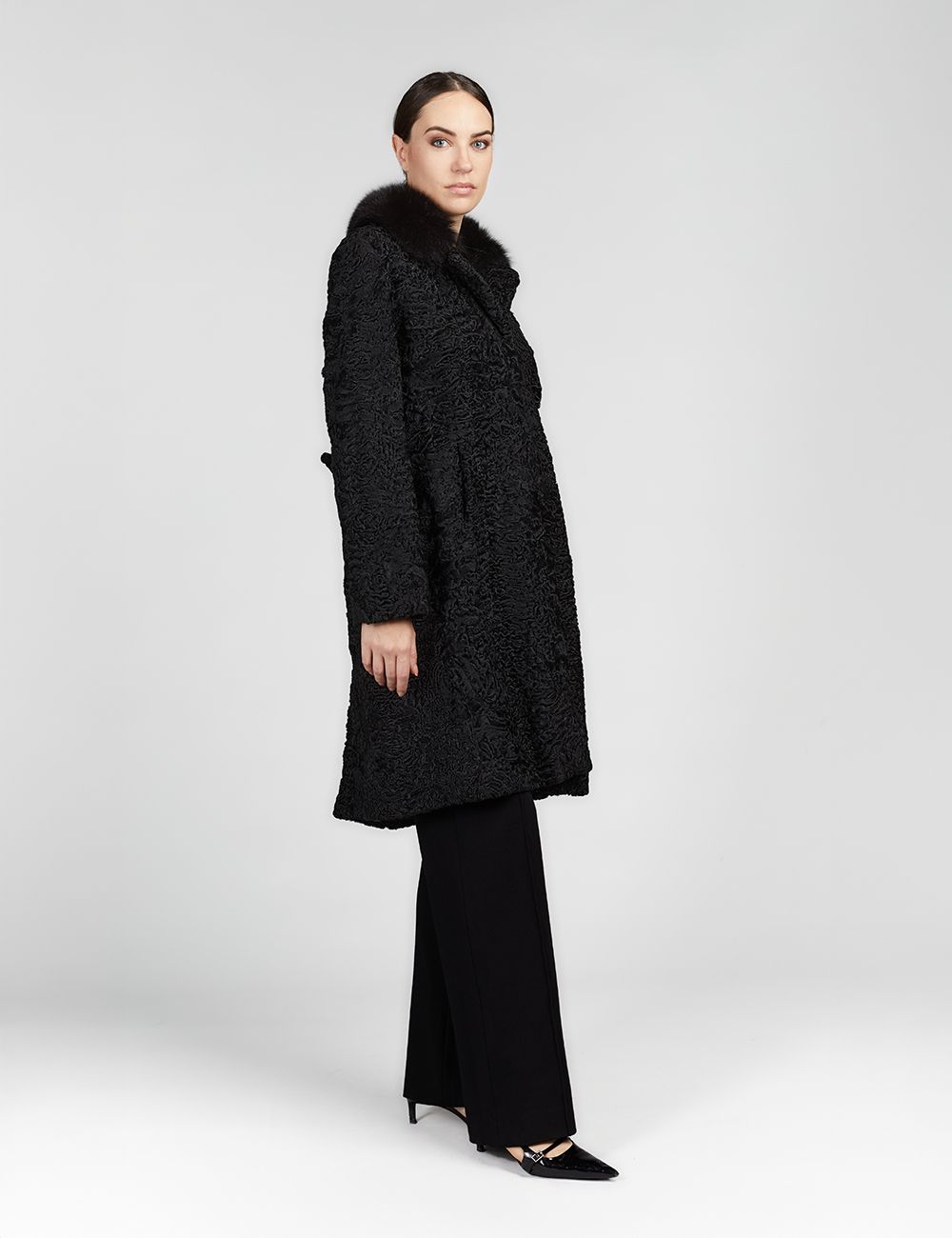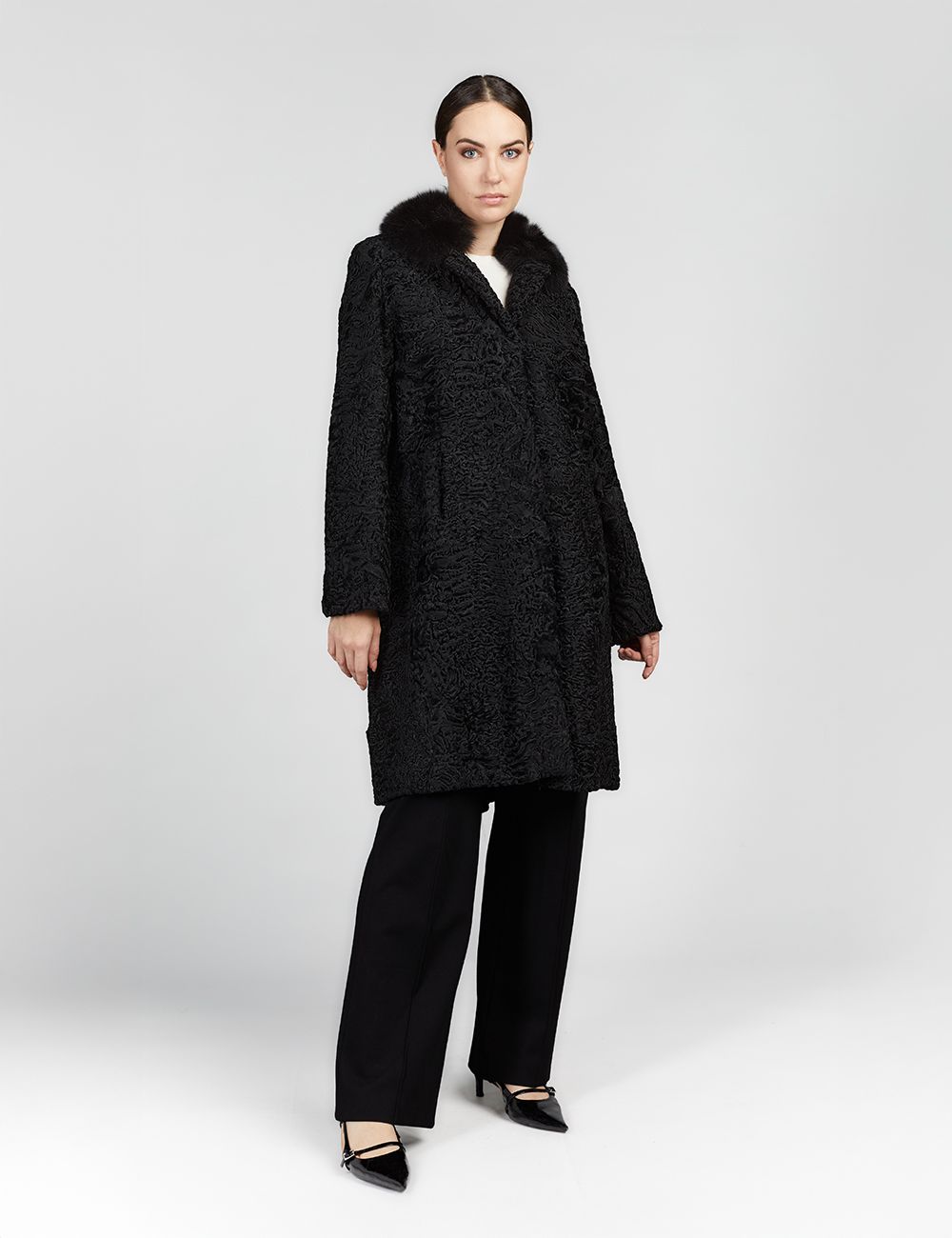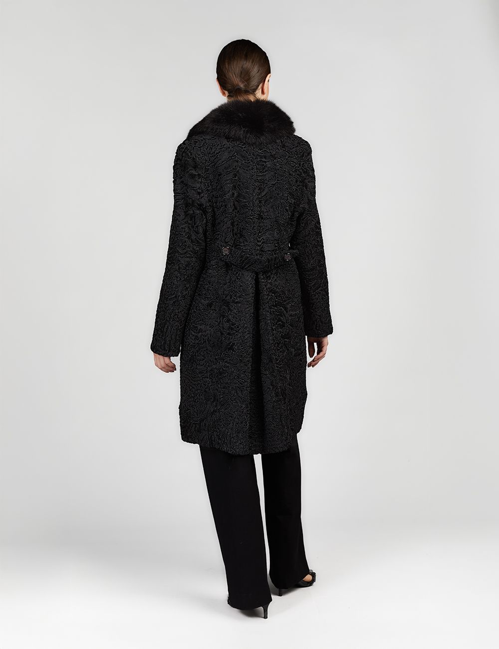 Cappotto al ginocchio in persiano con collo in volpe nero 100cm