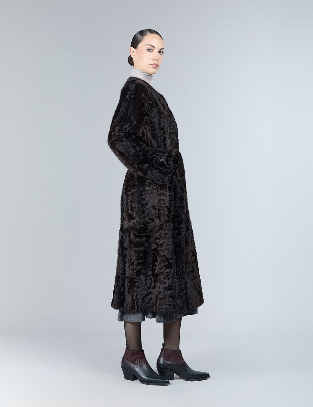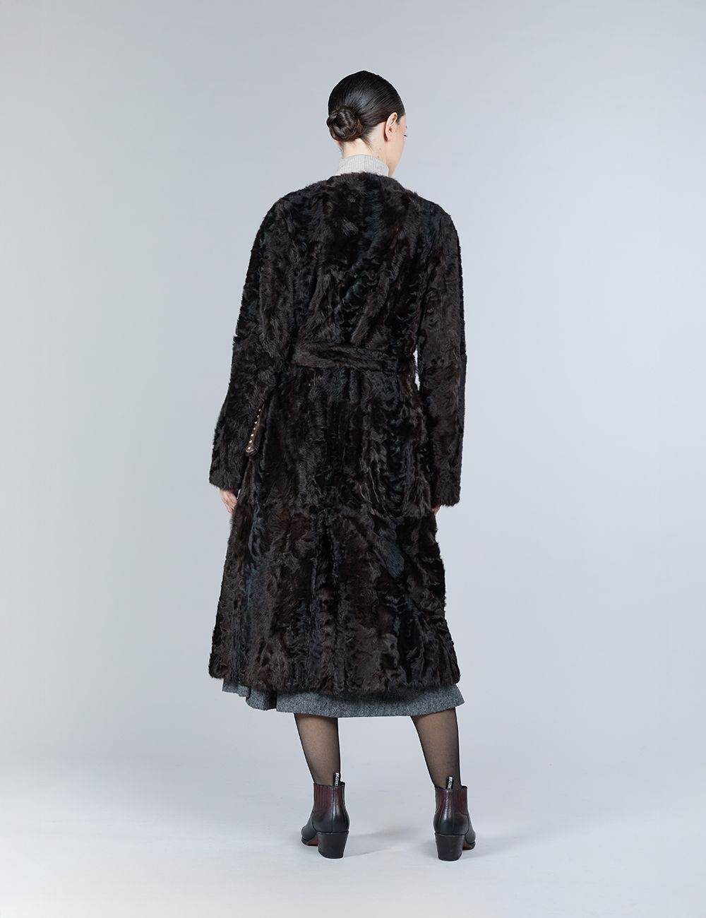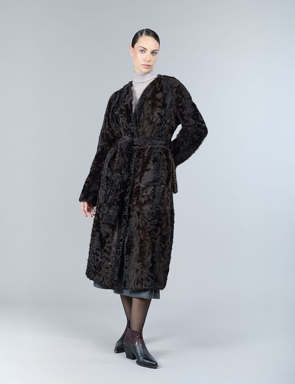 Cappotto in morbido lamb skin con collo sciallato e cintura coordinata che valorizza la linea femminile. Chiusura a portafoglio, stile elegante e disinvolto, 120 cm