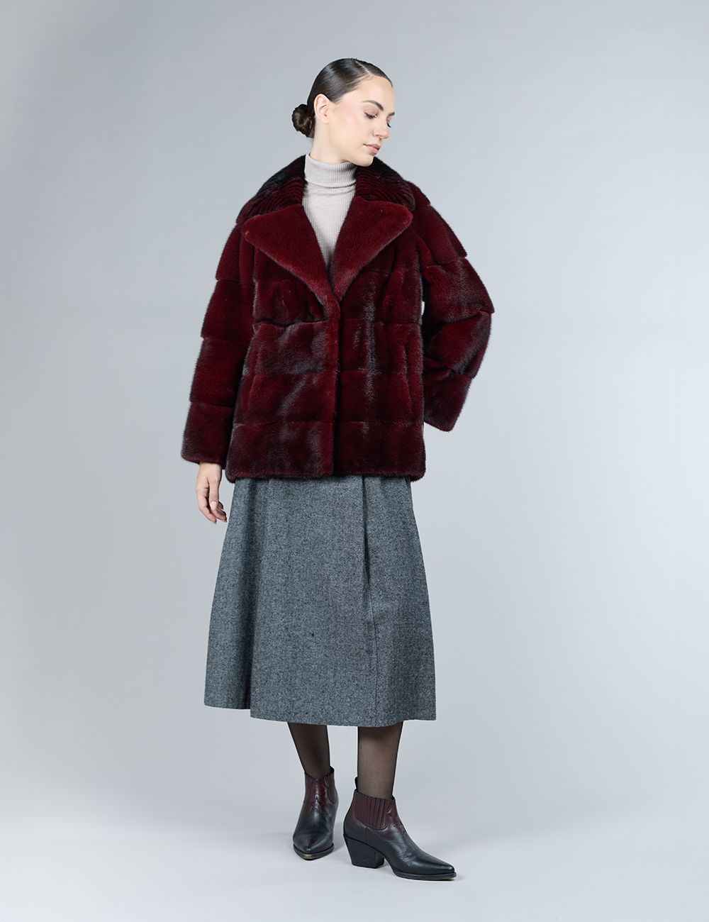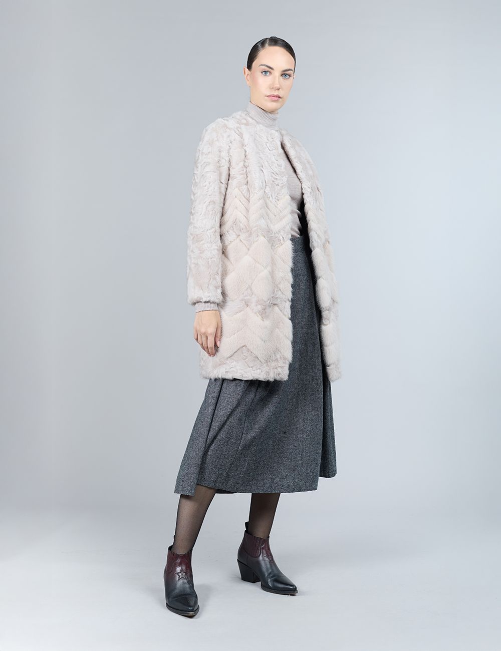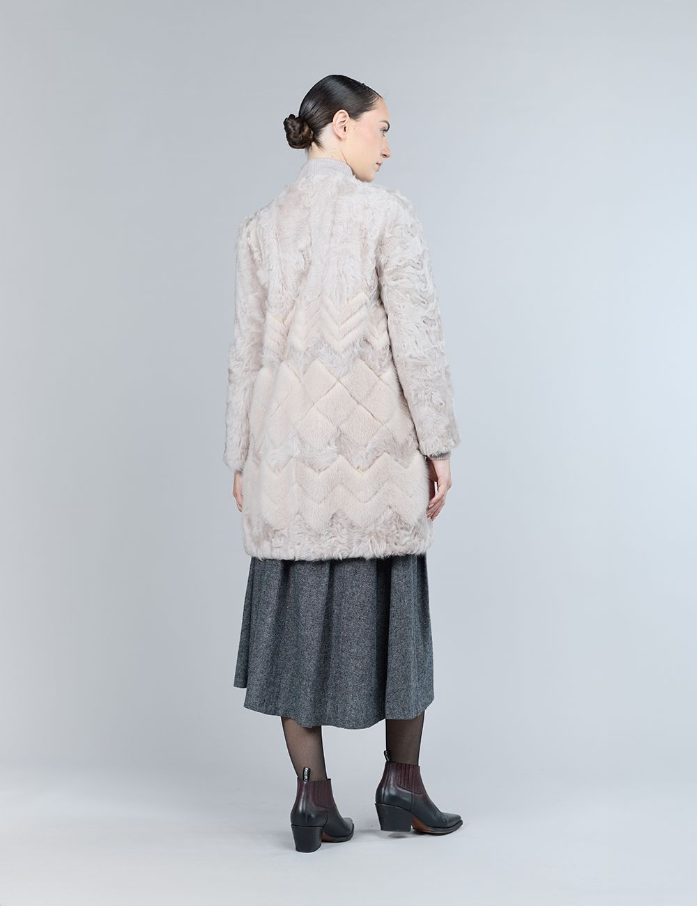 Cappotto in morbido lamb skin con disegno geometrico in visone tono su tono, linea dritta e taglio pulito, 90 cm