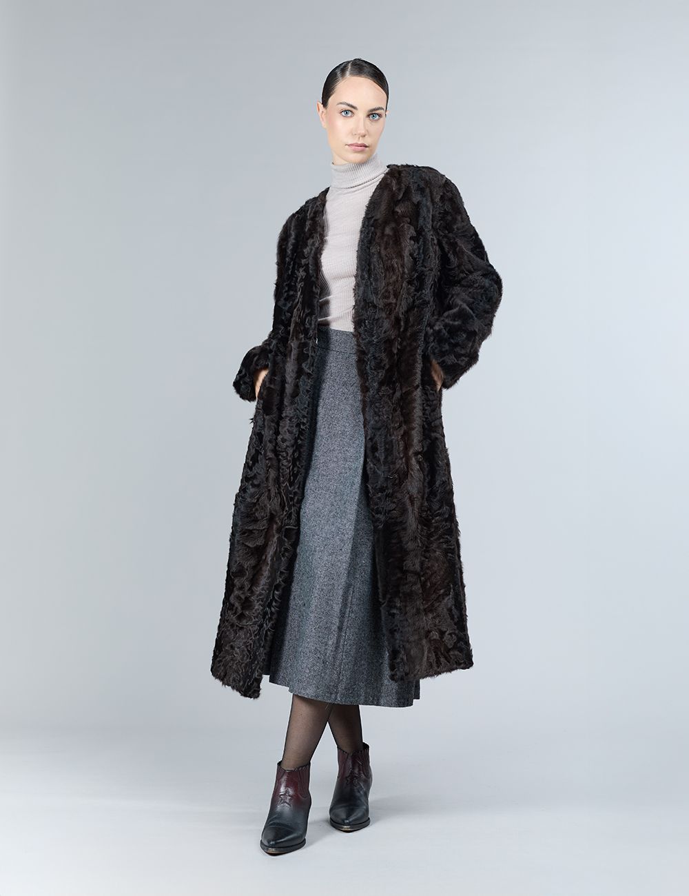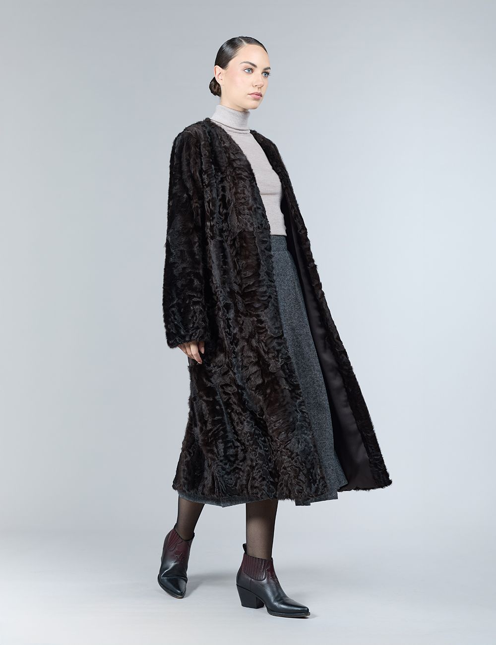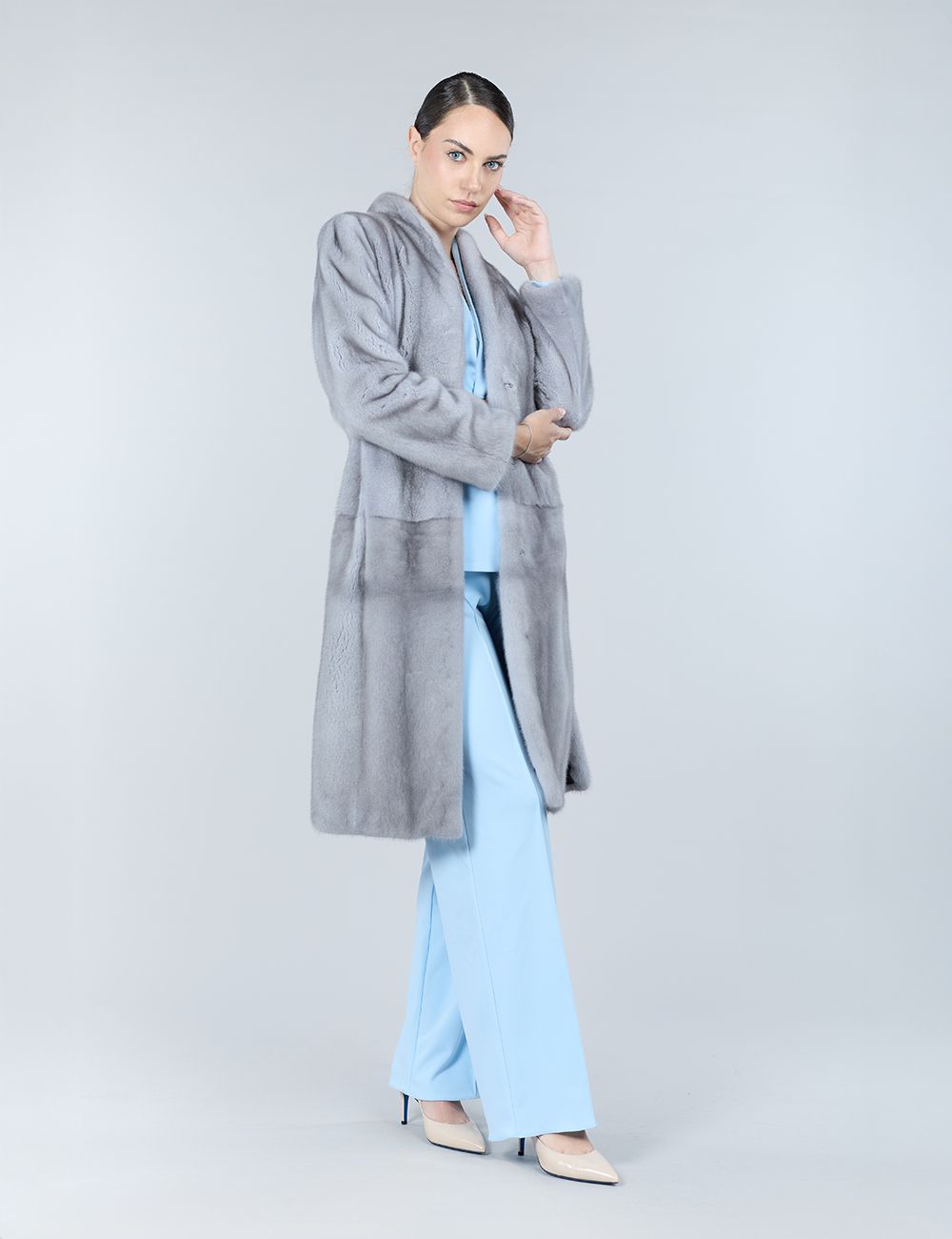 Cappotto in lamb skin con lavorazione a zig-zag in visone, ghiaccio, 100 cm