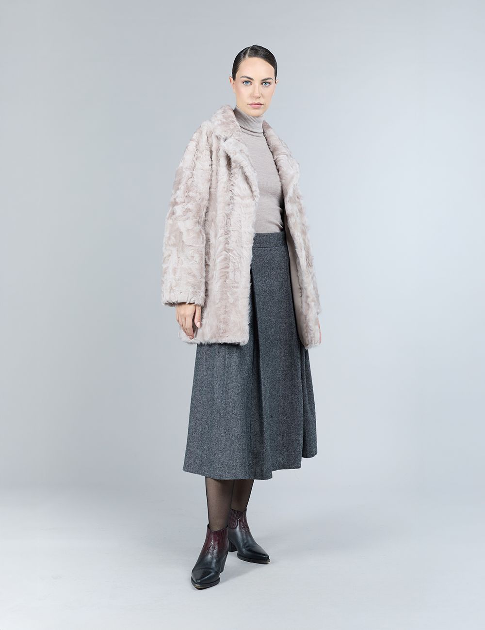 Cappotto in morbido lambskin color cipria con elegante collo inglese e chiusura nascosta, 80 cm